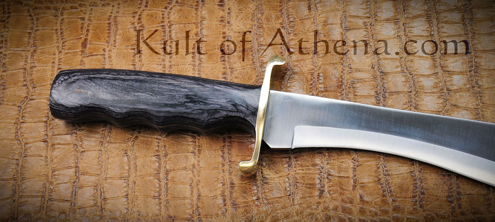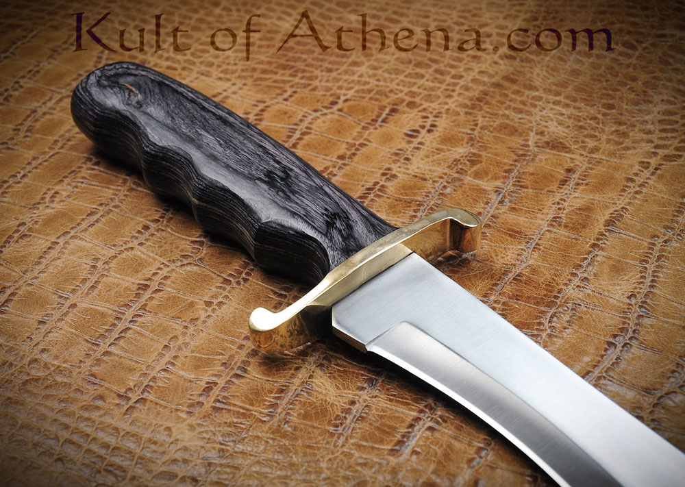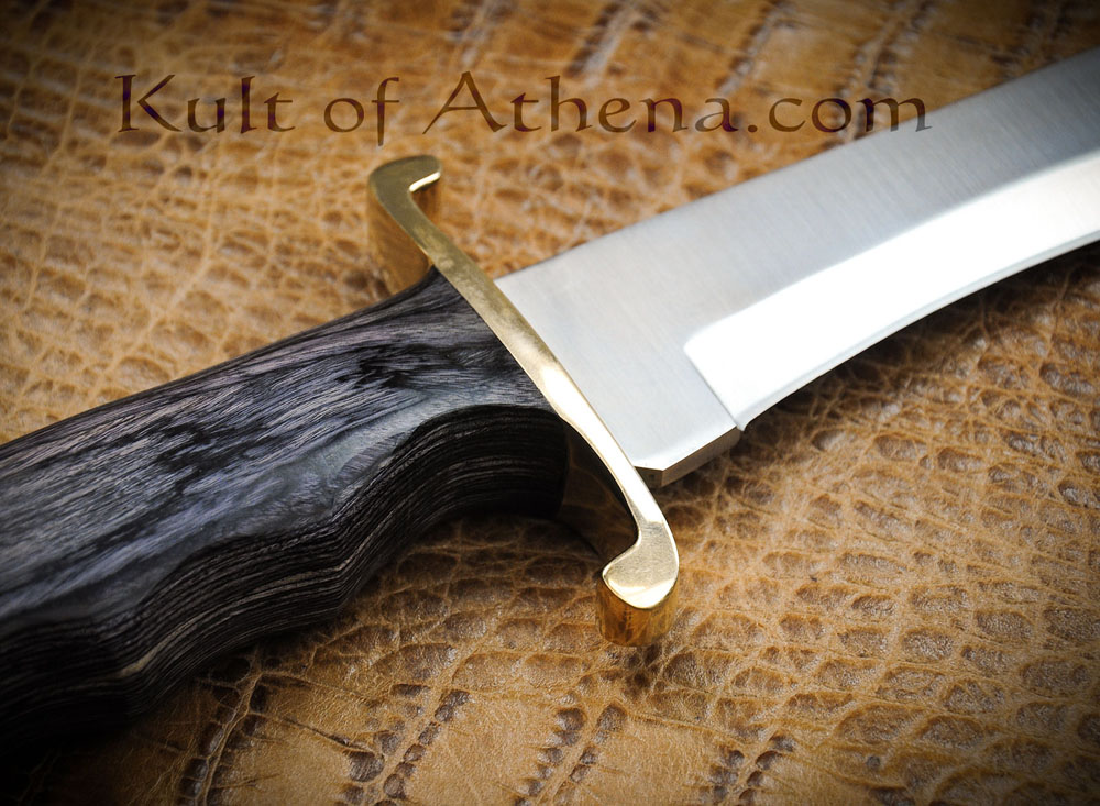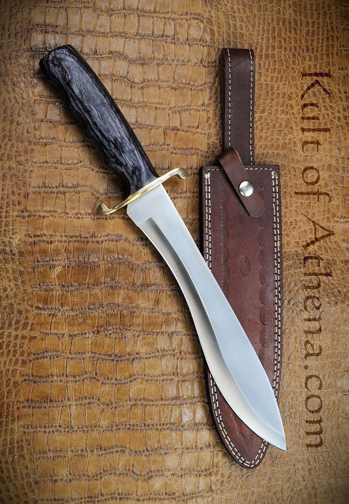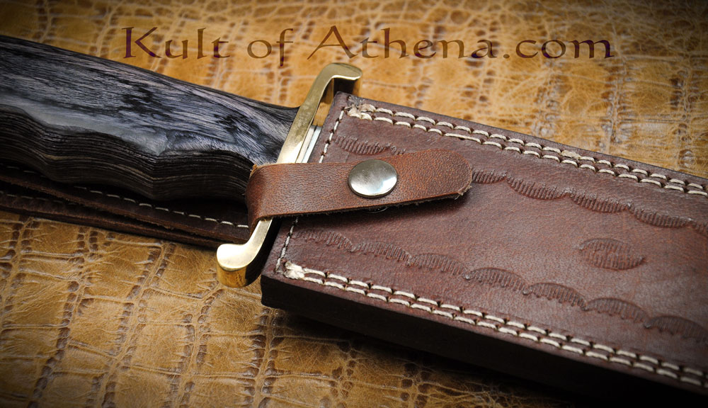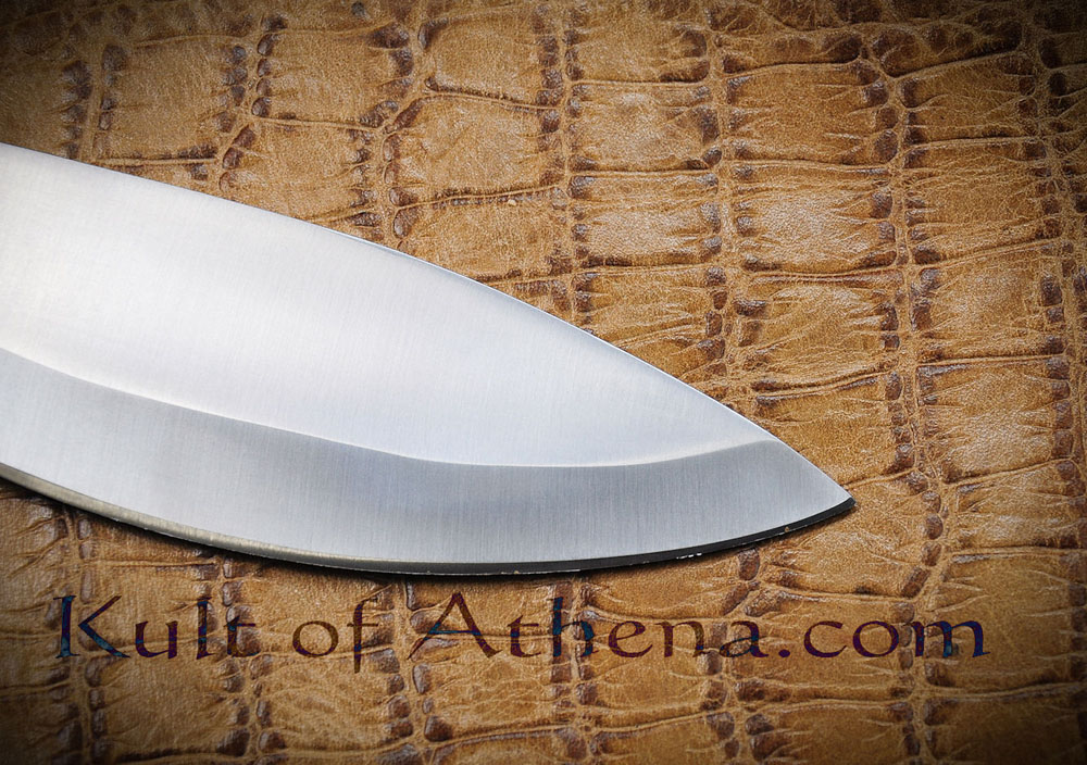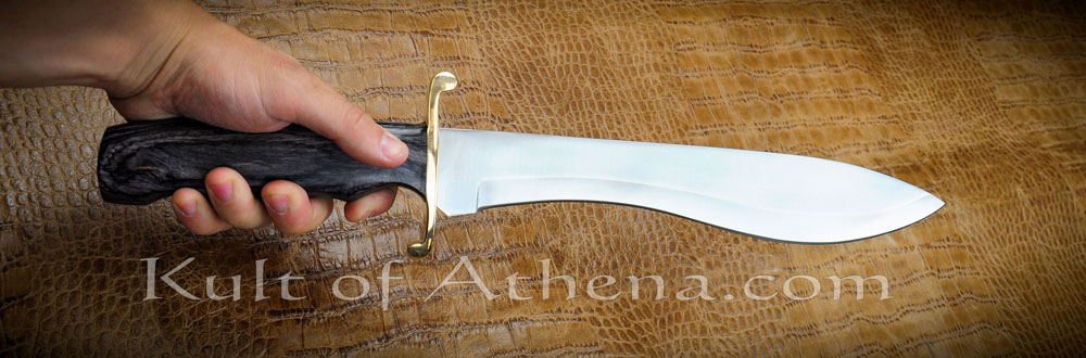 A nice looking and affordable knife. It just arrived, so I have yet to thoroughly test it, but it seems to be a quality blade. The blade comes sharp enough to slice through an envelope, and I always liked the shape. Aside from the leaf blade, the convex to concave blade shape is elegant, useful, and in my opinion, beautiful. The blade metal had no pitting or light rust, which was good, since it wasn’t shipped with a coating of oil or cosmoline. The sheath is of good quality leather that is actually very thick. It feels like the sheath should have cost at least $30 by itself. The handle of this blade feels like strong wood, but it’s weight throws me off. I’m not sure if the wood is kind of cheap, or if it isn’t full tang, which brings me to my only complaint; I can’t tell if it is a full tang or not. The end of the tang isn’t visible (which I already knew from the pictures) but I didn’t feel it’s weight when holding the knife. Even if you can’t see the tang or pommel, you often can feel it’s weight. This knife is top heavy, so maybe it’s just hard to notice it. Considering the cost, if it is a full sized and full length tang, then this is probably the best deal on a knife on all of KOA.