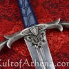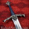 The blade is tempered high carbon steel which has been mounted into a hilt of antique-finished metal. The crossguard has been fashioned in the likeness of the blooming shoots of flowering springtime plants- an allusion to the hope of the ideal Kingdom of Camelot. The center of the crossguard bears Kingly heraldry with three crowned shields surmounted by dragons rampant. The wood grip has been carefully bound in fitted, midnight-blue leather and textured with skillfully-laid risers beneath the leather and the pommel sits atop the sword in a form akin to a regal crown. The companion scabbard for the sword is crafted from wood which is overlaid in matching leather and completed with antiqued metal fittings. Despite its imposing scale, this sword is surprisingly lightweight and easy to wield in a two-handed grip.