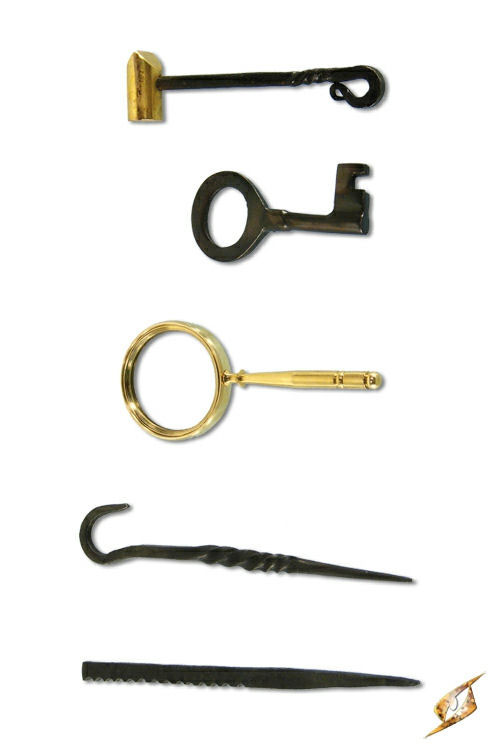 Epic Armourys Thieves Tools are a collection of steel and brass tools designed to pick locks or disable traps. The set includes a lock pick, mini saw, functional brass magnifying glass, universal key and a tiny hammer.