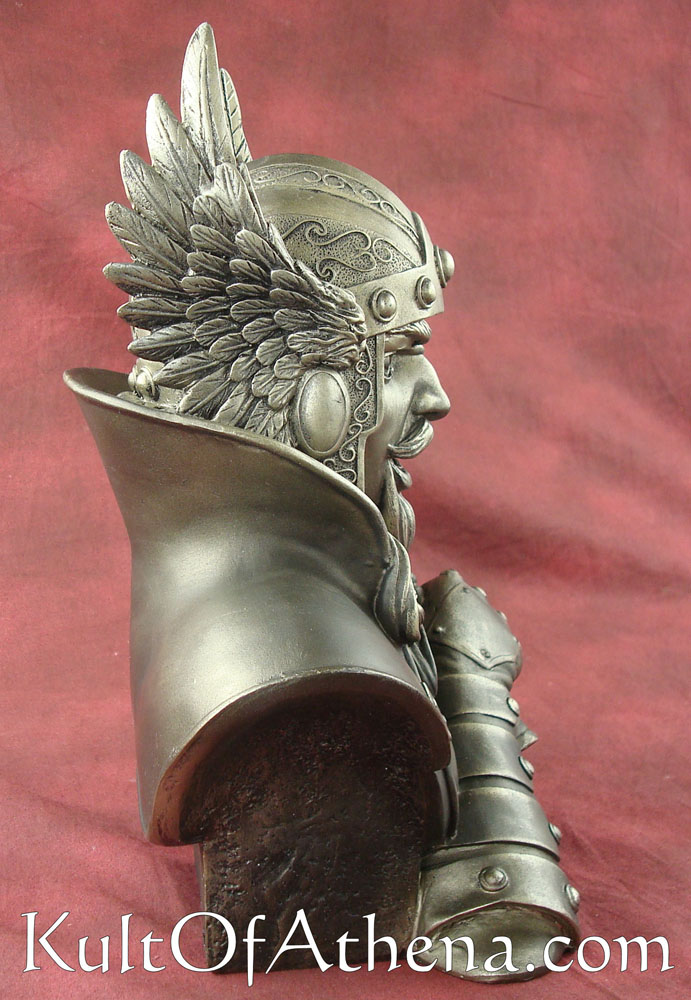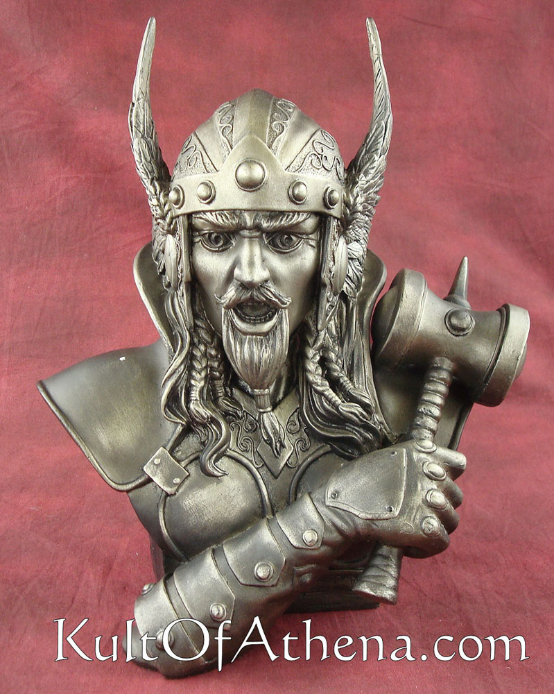 This bust of the Norse God of Thunder, Thor is made of cold cast resin with a metalic finish.