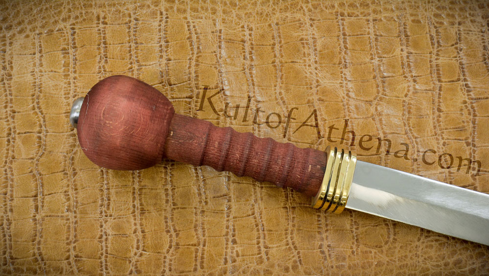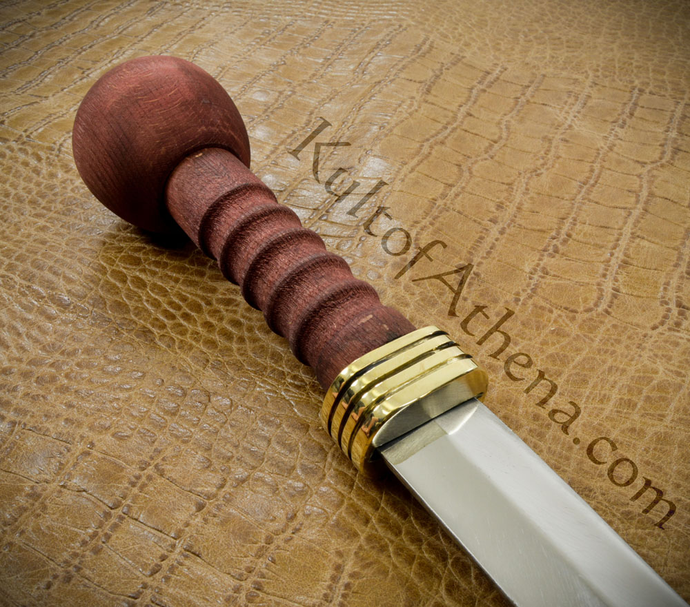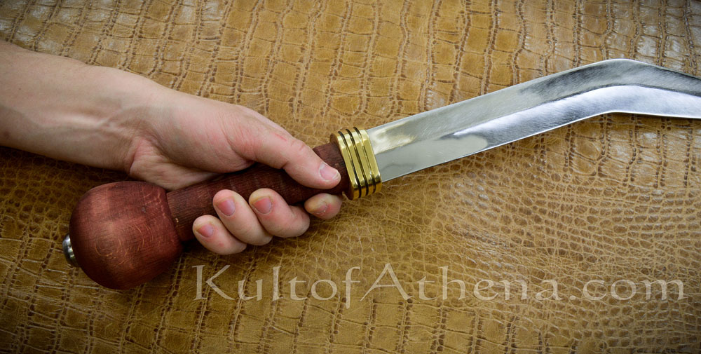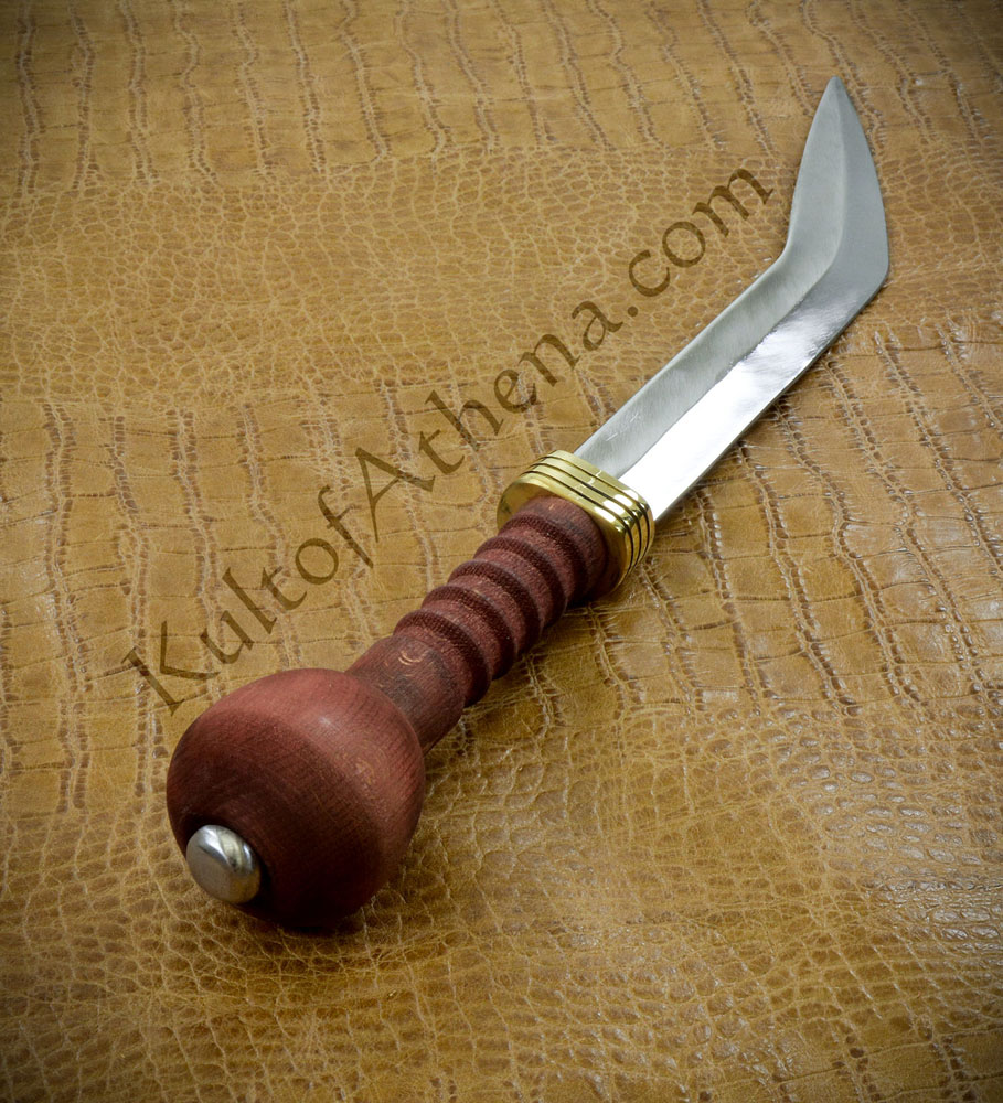 This Thracian Short Sica is crafted with a blunt blade of high carbon steel with a finished, tempered hardness of 50-52 HRC. The thick-edged blade is specifically crafted for stage and sport combat and has edges that are at least 2 mm thick. The bolster is brass and the grip and pommel are carved wood.