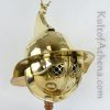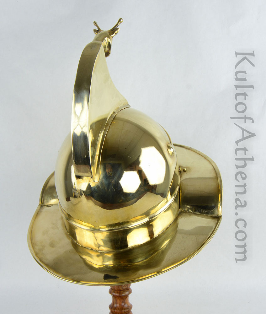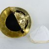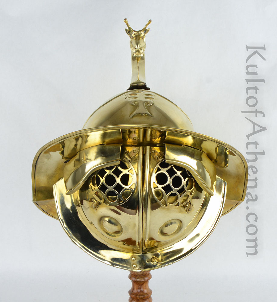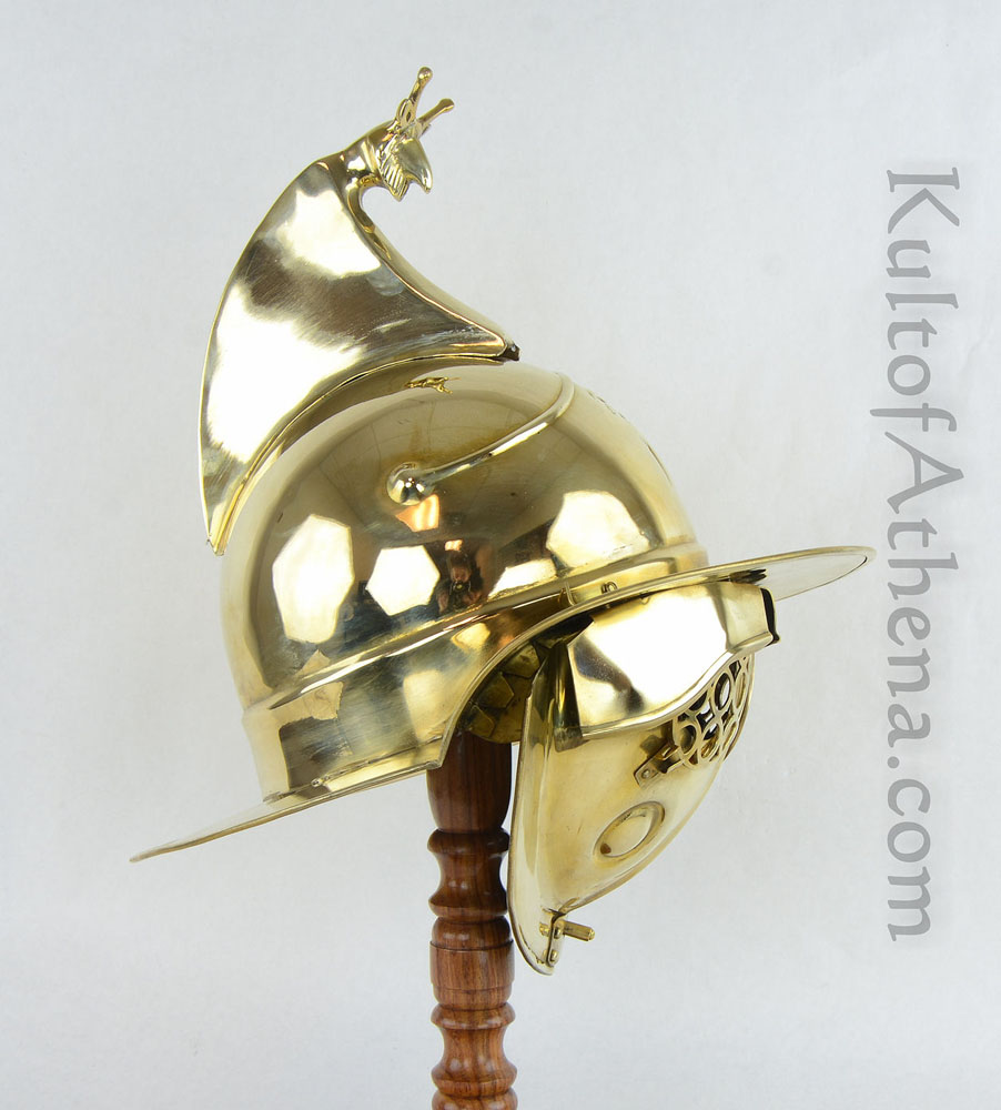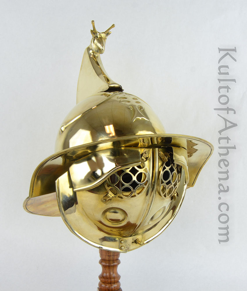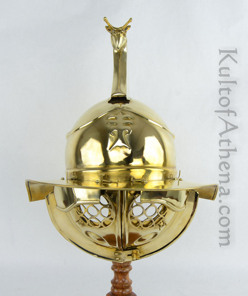 This Thraex Gladiator Helmet is constructed from 18 gauge brass; the interior is unlined and blackened – included is a separate padded cotton arming cap. The two halves of the face mask are secured with a slot and key pin and both halves of the mask can be removed entirely by taking out the retaining pins which affix the mask to the helmet brim.