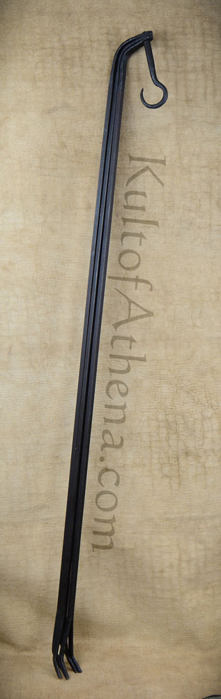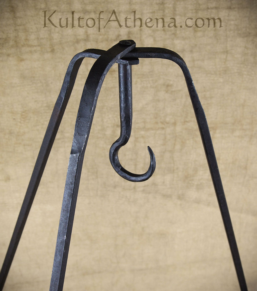 This Three-Legged Kettle Stand is hand-forged from iron; Its three legs and the hook are riveted into a single piece which swivels open and close for easy storage or transportation. The pronged feet allow it to be securely anchored into the ground when in use. The height is adjustable by changing the relative angle of the legs.