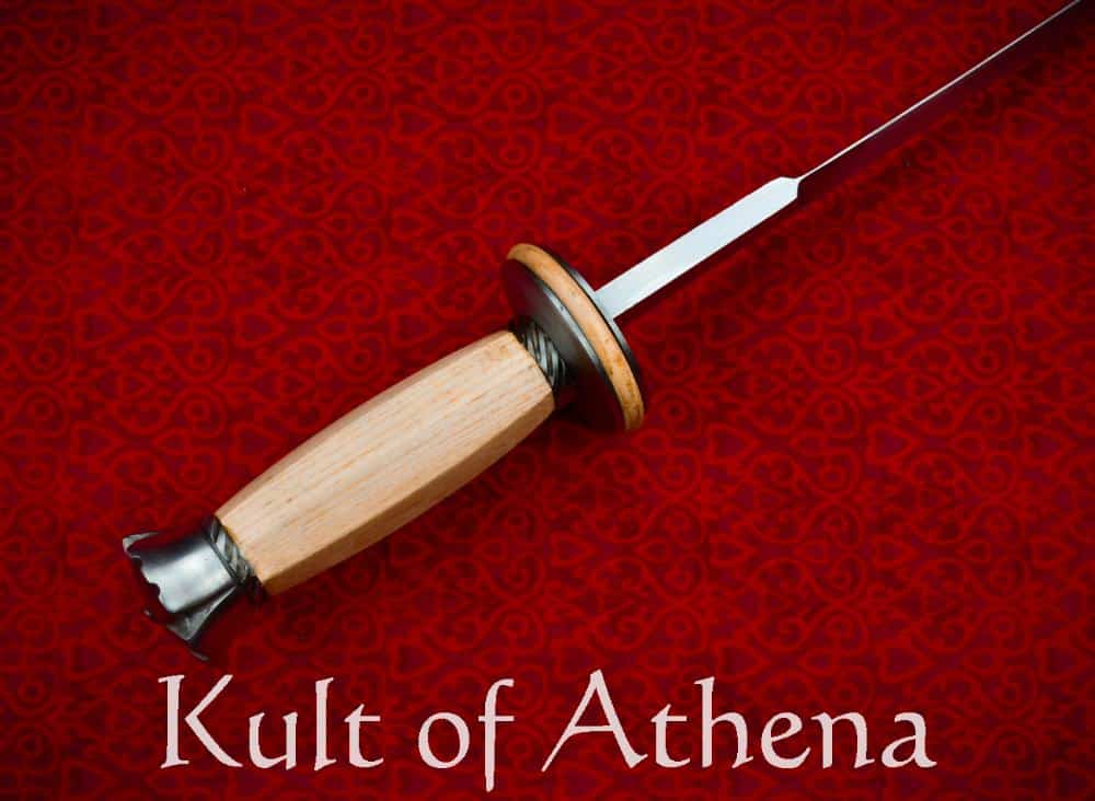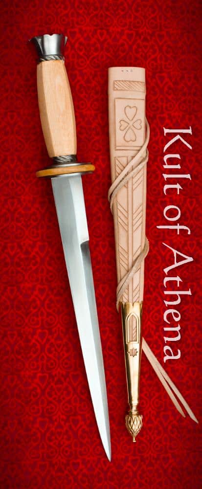 This particulary fine example of a Rondel dagger is an example of its earlier form from the 14th Century – this early Rondel still has a more traditional dagger pommel instead of a disc pommel typical to later examples. The disc is just the right size to both afford excellent protection to the hand, but also give the hand or thumb something to press against when driving the dagger home – that extended contact with the hand also improves one’s control on the dagger notably. The blade on this recreation has a very thick and rigid blade that is a very capable puncturing dagger as befits a bearer who is mindful of the improving armor of the time. The design is clever by giving the blade an exceptionally thick ricasso in order to reinforce the blade, allowing it to be used as a “bar” for leverage in prying through the the gaps in an armored defense or as a lever for controlling an opponent in a grapple – that thick ricasso gives the blade the durability to resist substantial force on a spot that is normally a weak point for thinner daggers. That ricasso rapidly tapers into a second cutting edge giving the dagger two capable edges for very good cutting performance.