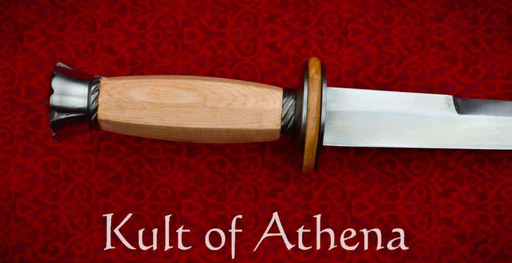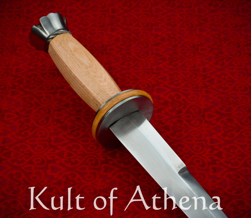 The blade is forged from high carbon steel; the guard is a composite with two concave plates of steel intersected by a gorgeous rondel of polished wood. The grip is stout ash wood and the pommel is likewise of steel. Included is a genuine leather sheath made from high quality vegetable tanned leather which is double layered for durability. A beautifully cast brass chape and leather cords for wear complete the sheath.