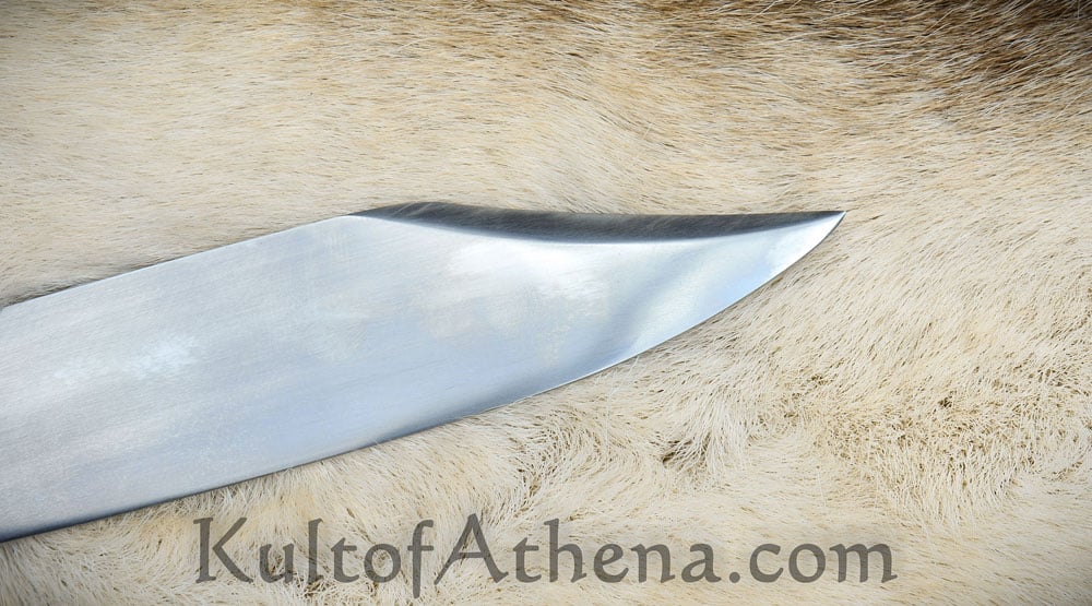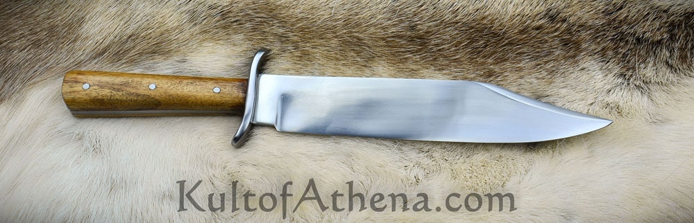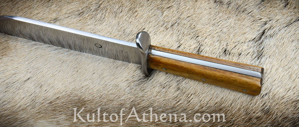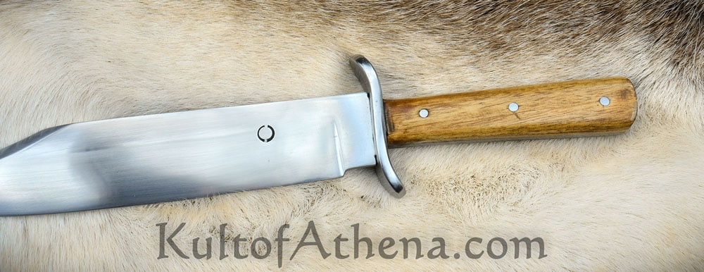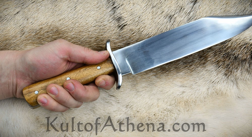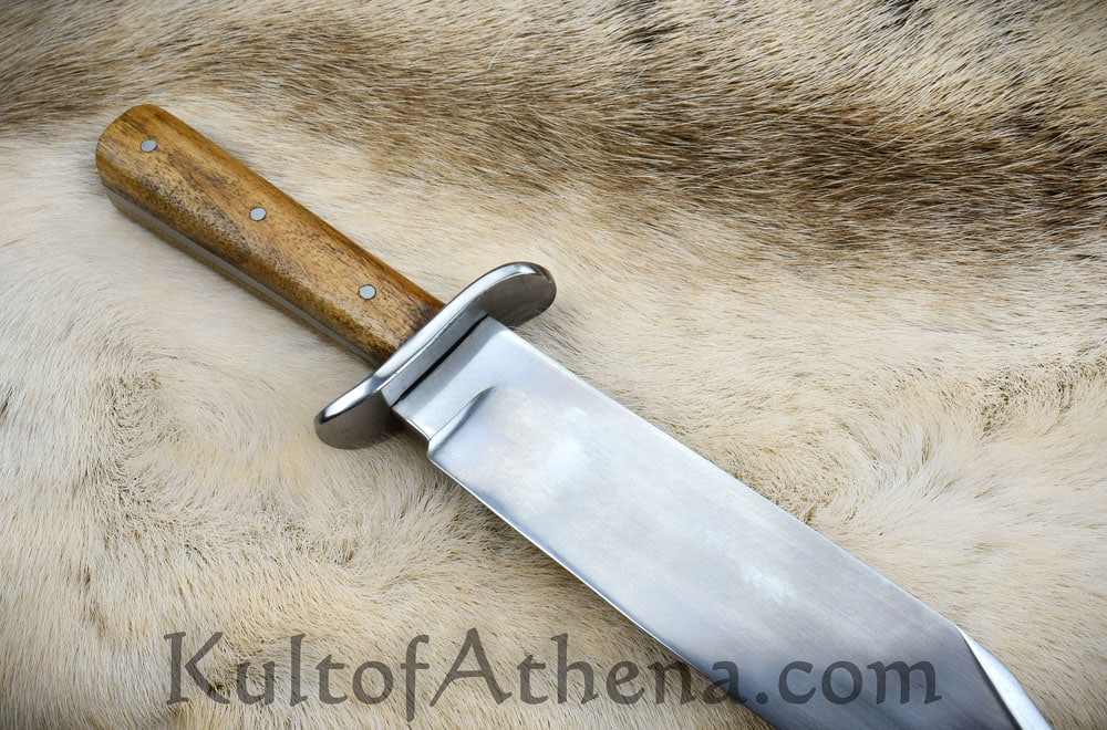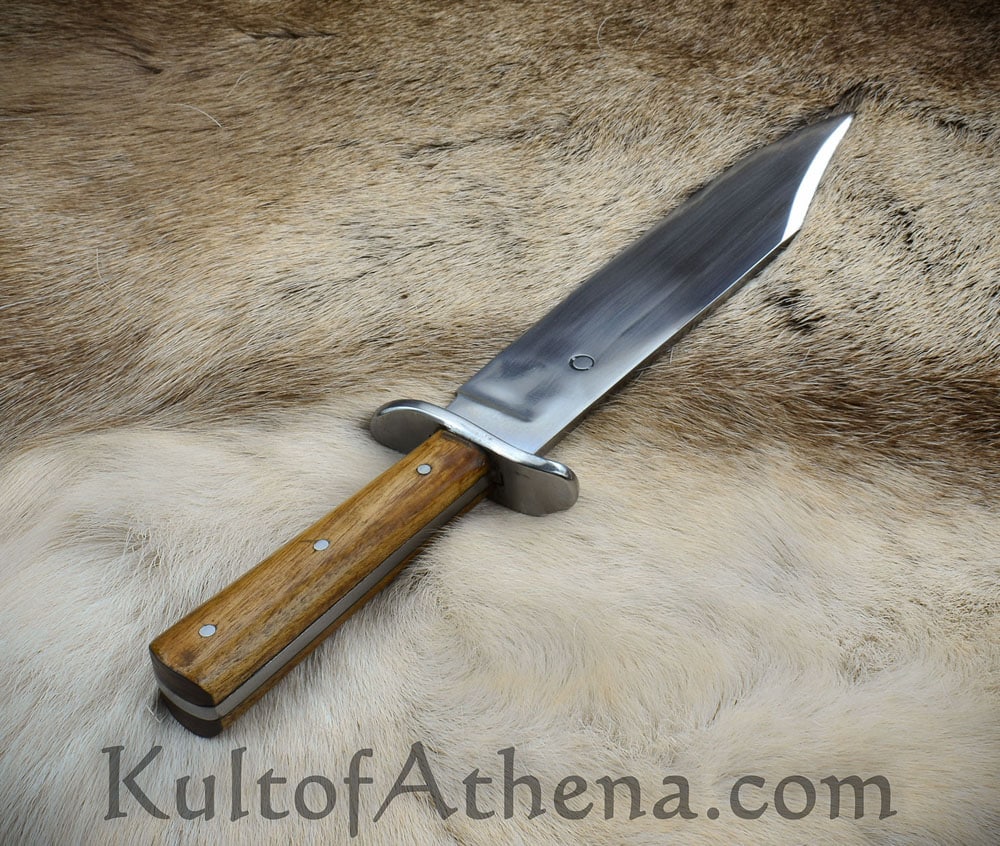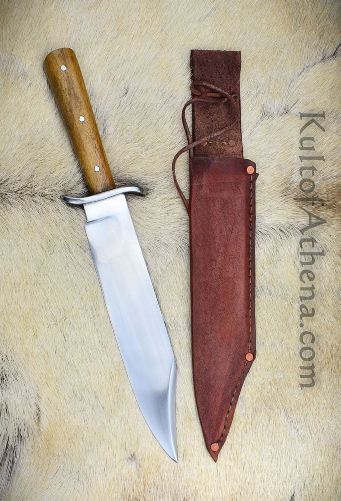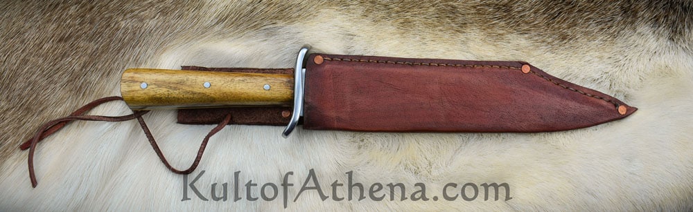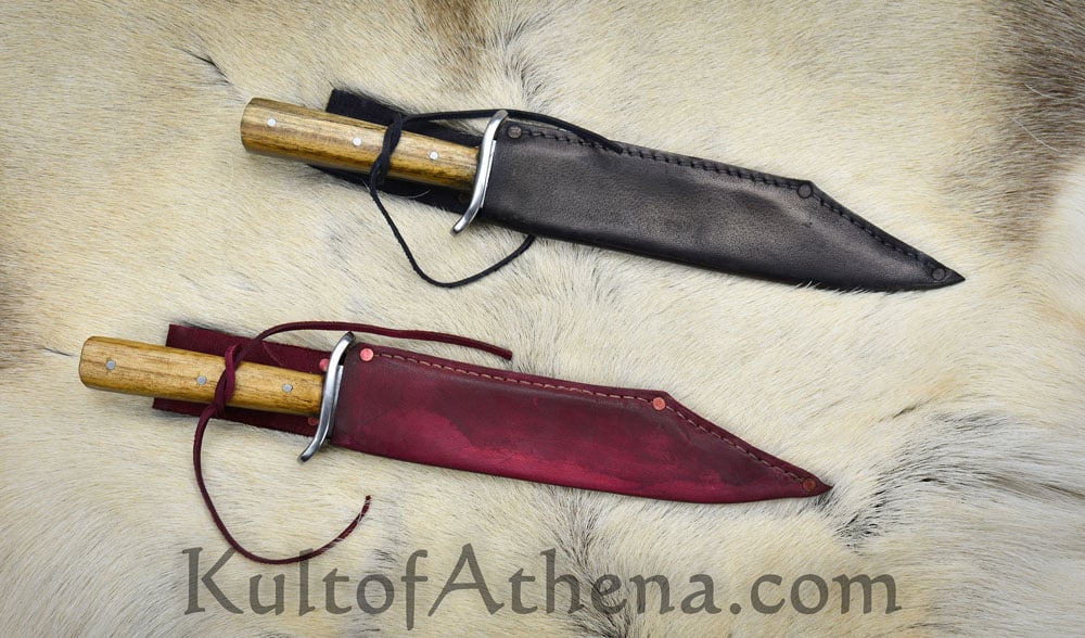 The blade of this recreation is forged from high carbon steel; the guard is steel and the grip is constructed with a robust full tang assembly by triple riveting two wood grip scales directly to the thick blade tang. Included is a stitched sheath of brown leather with a belt loop and leather grip tie cords. Most of the photos show an example with a brown sheath. The last photo shows examples in some of the other sheath colors available.