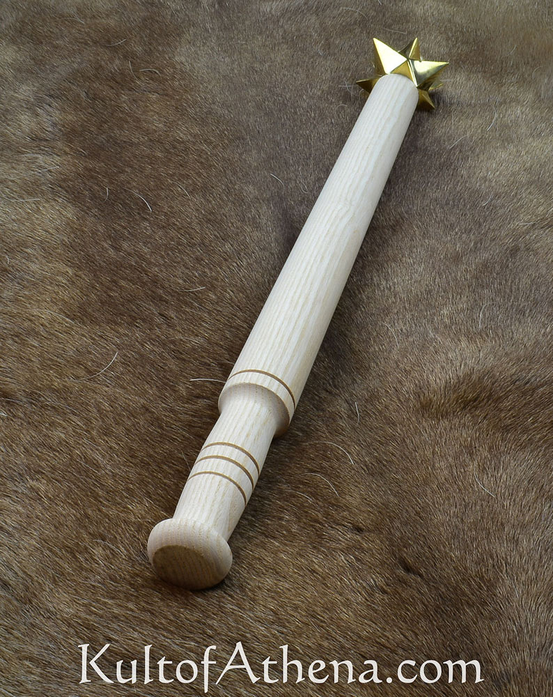 This wicked looking mace has a spiked head which is cast from brass and mounted onto a robust haft of ash wood. A wooden wedge driven into the socket gives it a tight fit which was further reinforced with glue.