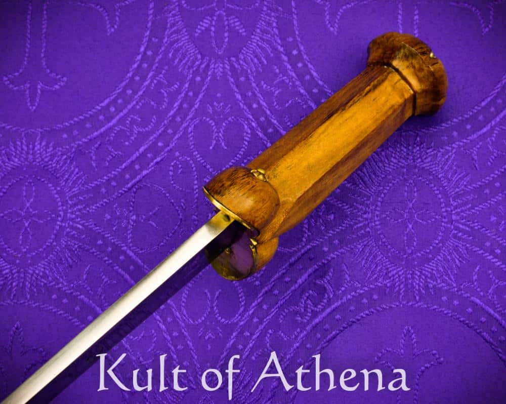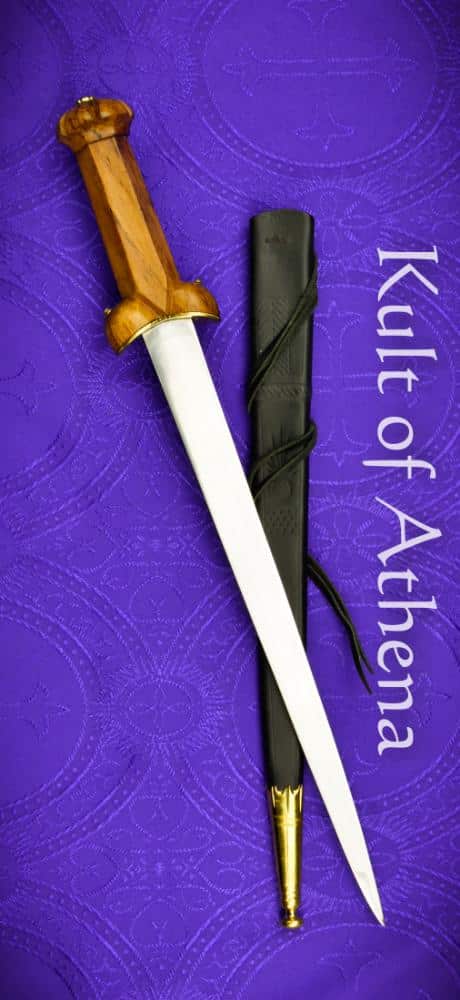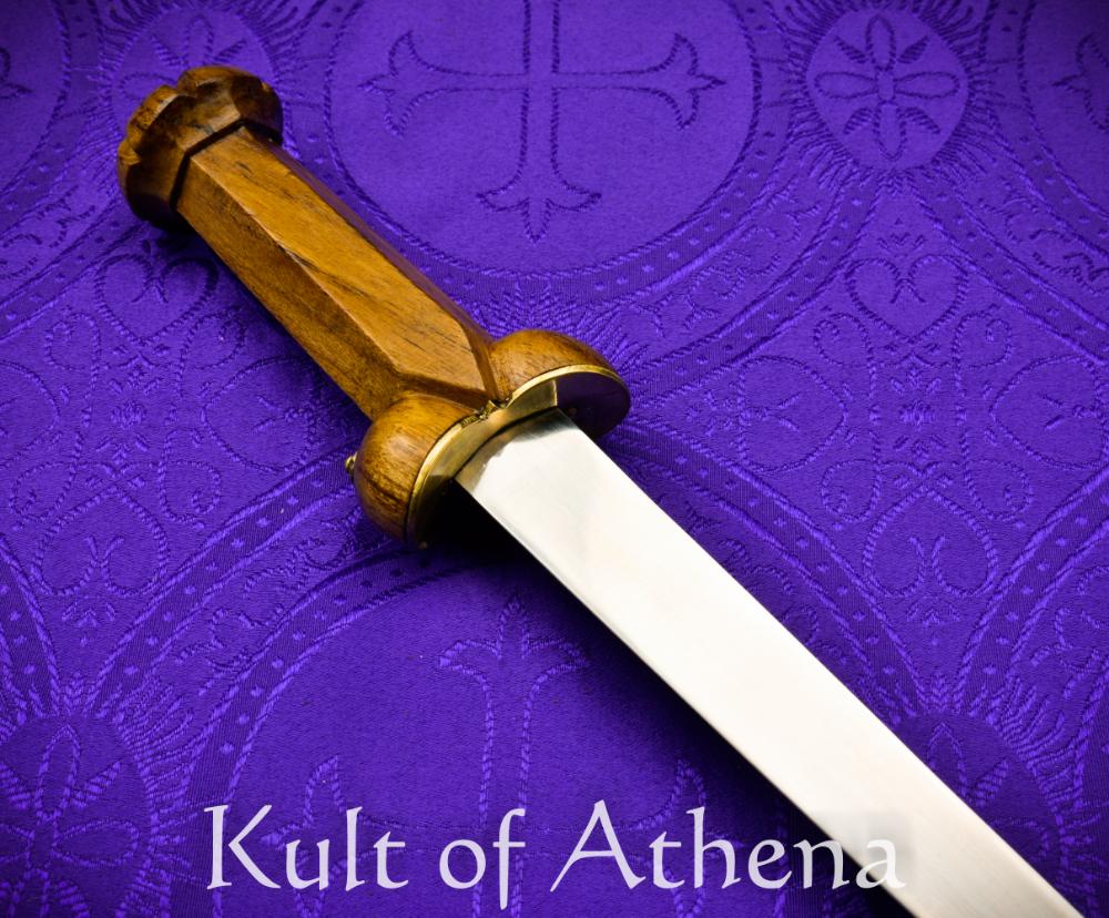 The blade of this replica is made from EN45 high carbon steel. The grip is well-carved from wood and the guard plate is fashioned from brass. The blade is anchored into the hilt with a nut and peen over the pommel. Included is a double-layered sheath of high quality vegetable-tanned leather which is embellished with stamped design and finished with a brass chape and two leather cords for tying onto your belt.