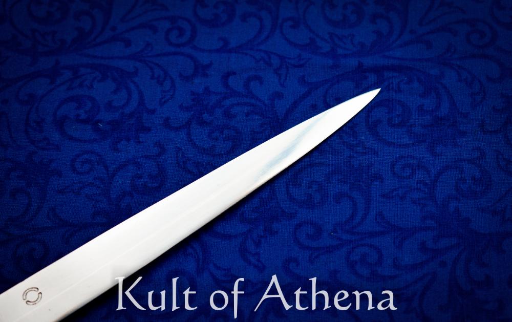 The blade is forged from tempered EN45 high carbon steel, a resilient spring steel well suited to functional edged weapons. Measuring almost 8 inches in length, the blade has proportions typical of late medieval daggers intended for both utility work and close-quarters fighting. The compact profile makes it quick to maneuver while still providing enough reach to serve as an effective secondary weapon.Weighing just 7 ounces, the dagger is exceptionally lively in hand. Its point of balance sits directly at the guard, giving it quick, responsive handling characteristic of thrust-oriented daggers. The 3.5 inch grip provides a secure hold and comfortable control, whether used in a standard grip or reversed grip as seen in period fighting methods. The blade is stoutly mounted into the hilt with a peen over pommel reinforced by three steel rivets pinning the grip scales directly to the blade tang.
