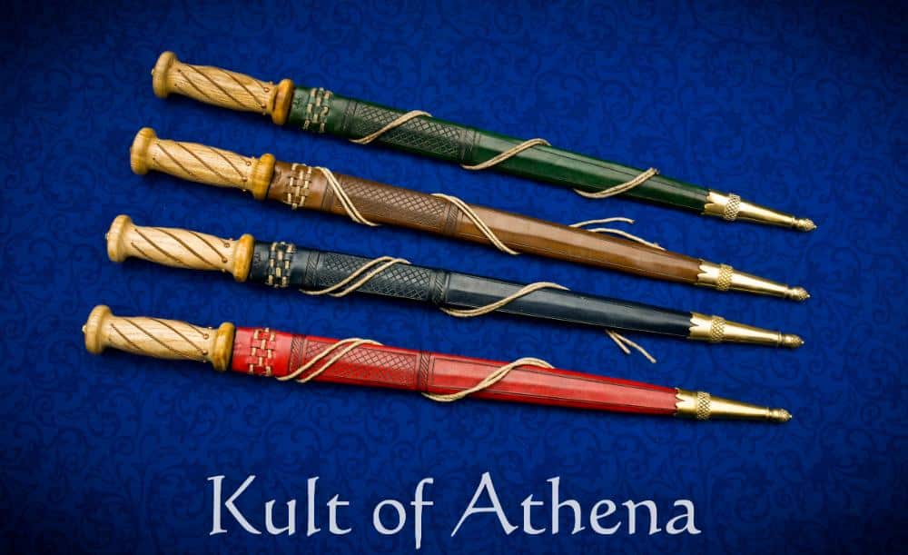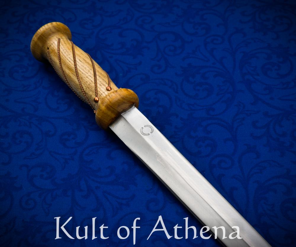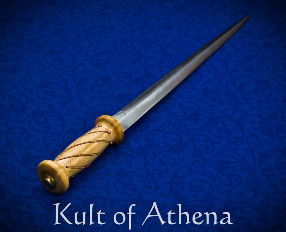 Though it does not have the fancier accoutrements, nothing was passed over in regards to making the dagger deadly and practical whilst giving it a touch of affordable style. The long blade is very rigid and will serve its bearer well as a can opener for defeating even the most heavily armored opponents in a grapple. This “ice pick” of a blade is securely mounted into a well-carved hilt of stout ash; care was taken to size the grip so that the hand can slot and “lock into” the grip which is just what you need to use the fierce piercing ability of this Rondel to its full extent. In an “ice pick” grip the pommel plate serves as a good anchor point for the thumb. The grip has inlaid braided copper wire that greatly improve the grip of the hand on the dagger and give it a practical flair of embellishment.