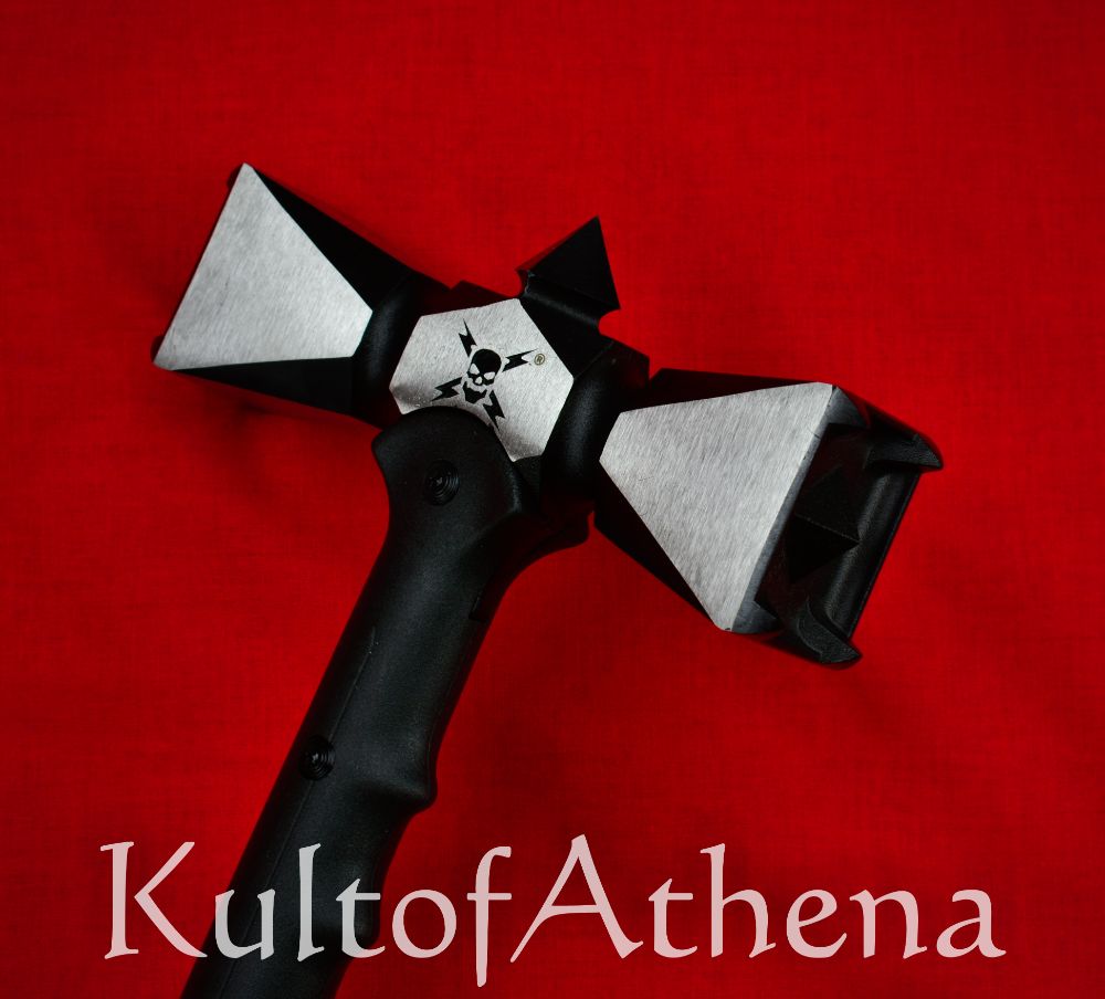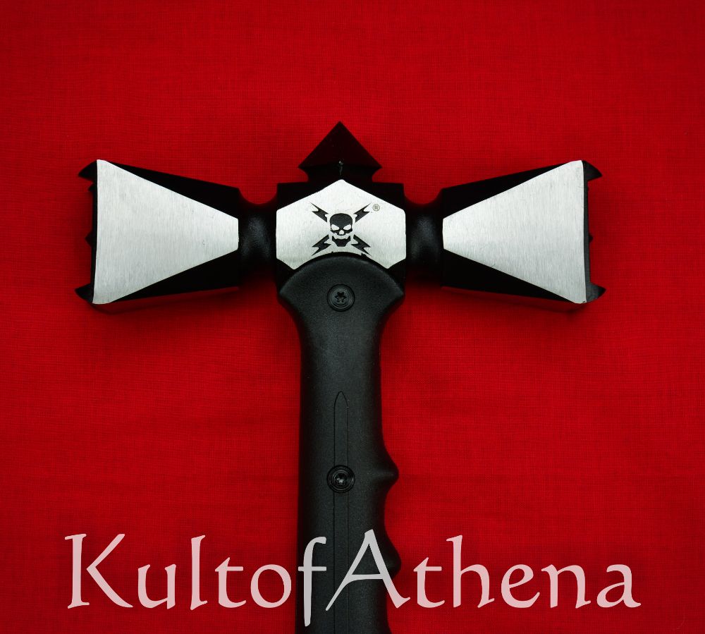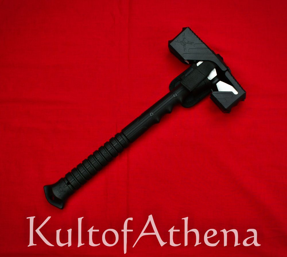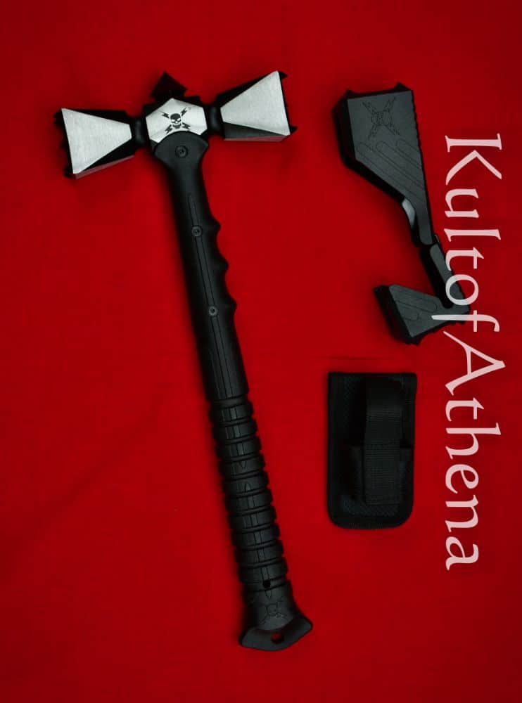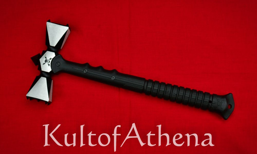 The M48 Double-Headed War Hammer is what you want to be holding in your hands when things get ugly! It has a vicious 6 1/2”, 2Cr13 stainless steel double-head with a black oxide coating and a satin finish on each of its faces. The hammer head features a skull crusher at its top and five penetrating points on each of its square-shaped heads. The handle is constructed of an almost indestructible injection molded nylon with a fiber fill and has a lanyard hole. Special grooves are designed into the handle specifically so that paracord can be wrapped around it with relative ease. The 17” overall, double-headed war hammer has a tough TPR cover to protect the head and removable nylon belt loop.