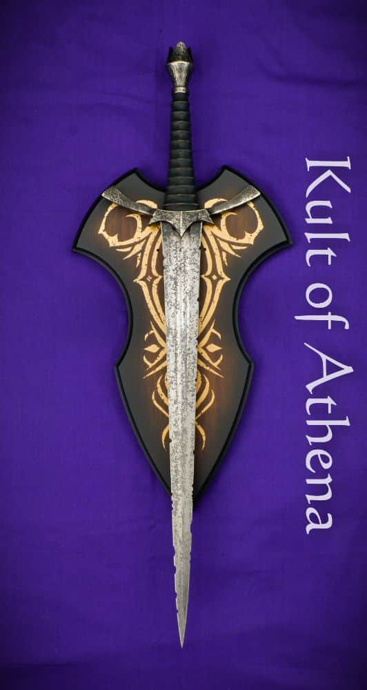 This authentically detailed replica is a reproduction of the actual filming prop. The MORGUL BLADE™ is 25 1/8” (63.3cm) overall, featuring a stainless steel blade, solid metal hilt parts, and a leather wrapped grip, all authentically “aged” and “battle worn” with a distressed, acid-etched finish to duplicate the original movie prop as closely as possible. It is presented with a wooden wall display (mounting hardware and instructions included) featuring a graphic motif of the Witch-King crown, and includes a certificate of authenticity.