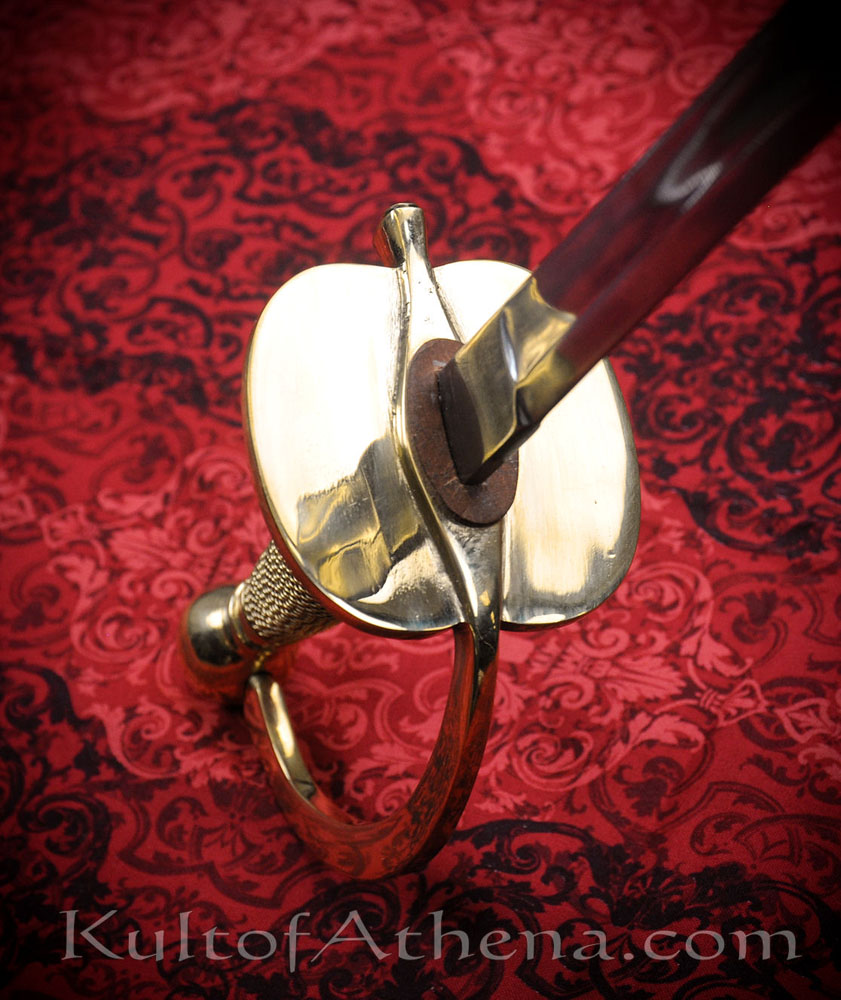 This replica of the US Model 1840 Non-Commissioned Officers Sword has a blade of 1055 high carbon steel. The entirety of the hilt is brass and the grip is wrapped with twisted brass wire. Included is a scabbard of steel with a pair of steel hanging rings.