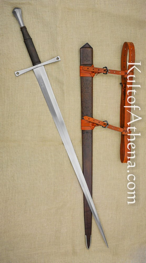 The diamond cross-section blade is fairly stiff to optimize it for thrusting to minimize loss of penetrative power to blade flex. The crossguard and pommel are mild steel and the Poplar wood grip is overlaid in tight leather. The sword is paired with a scabbard with a hard core of Poplar; it is finished with a binding of leather, a steel chape, and integrated metal hanging buckles. Included is a sword belt with a pair of strap hangers which can be adjusted in tandem with the scabbard buckles to control the height and angle that the sword is slung from the belt.