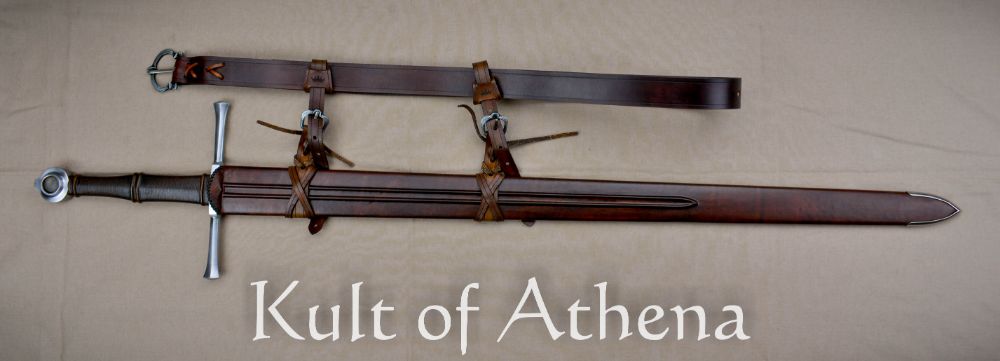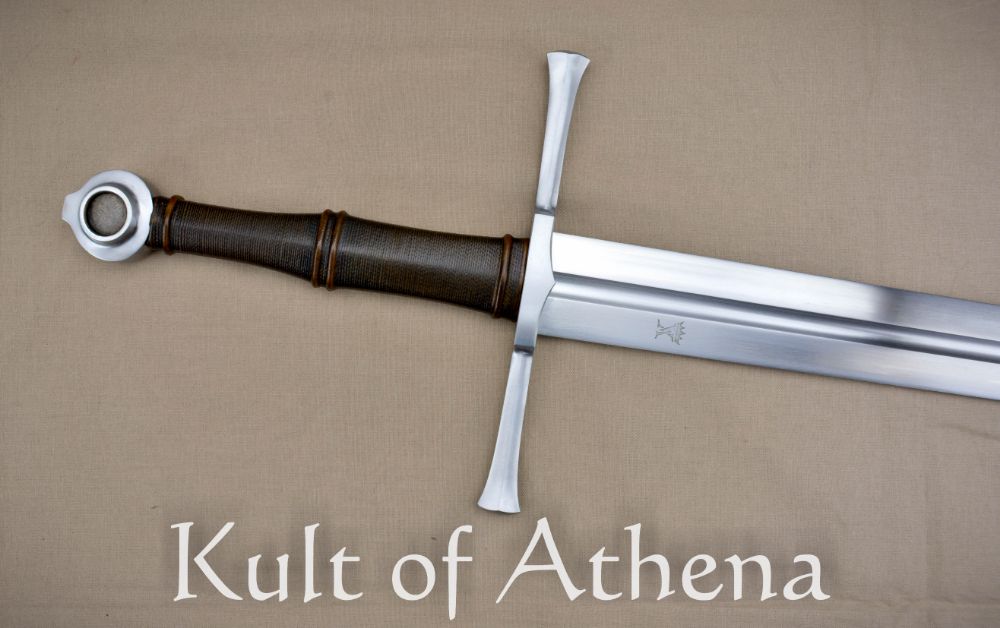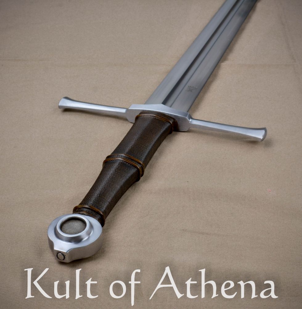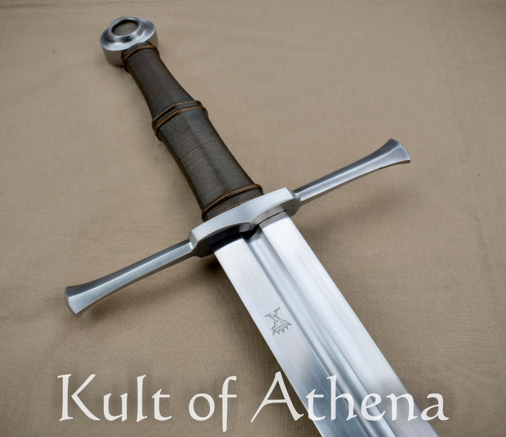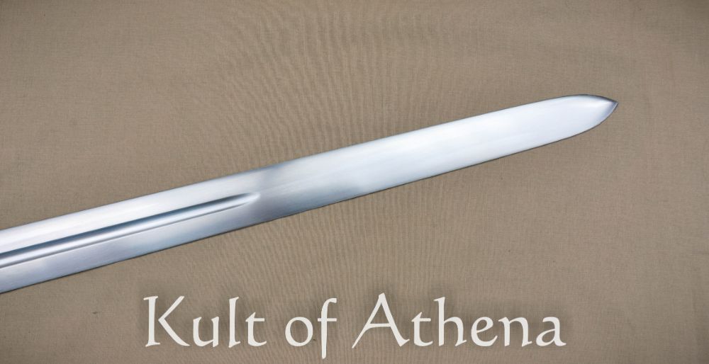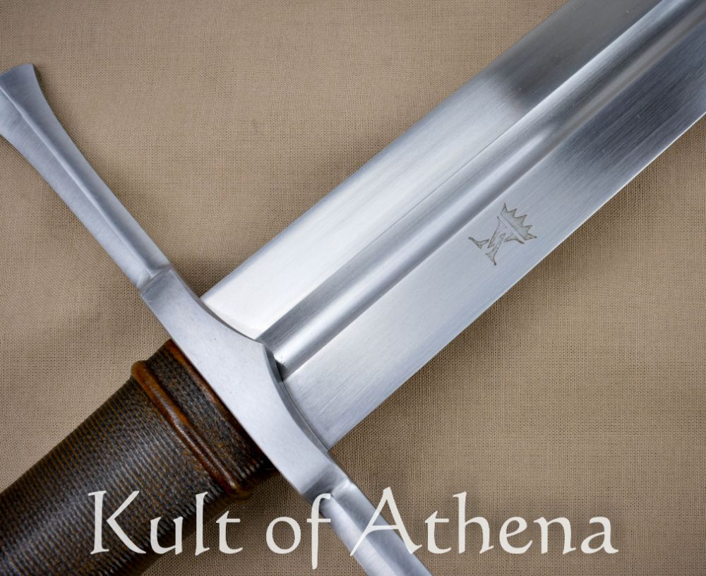 The Valiant Armoury Kriegschwert is a longsword built for delivering broad and sweeping cuts that slice into and pass through the target with power and velocity; hailing from Valiant’s Craftsman Series the sword is entirely made in the USA. The sharpened blade is 6150 high carbon steel with an overall tempered hardness of 52 HRc. The steel was twice-normalized to improve its internal grain structure and the edges are finished with resilient appleseed edge geometry. The crossguard and pommel are of satin-polished steel and the well-carved hardwood grip is tightly wrapped in quality leather.