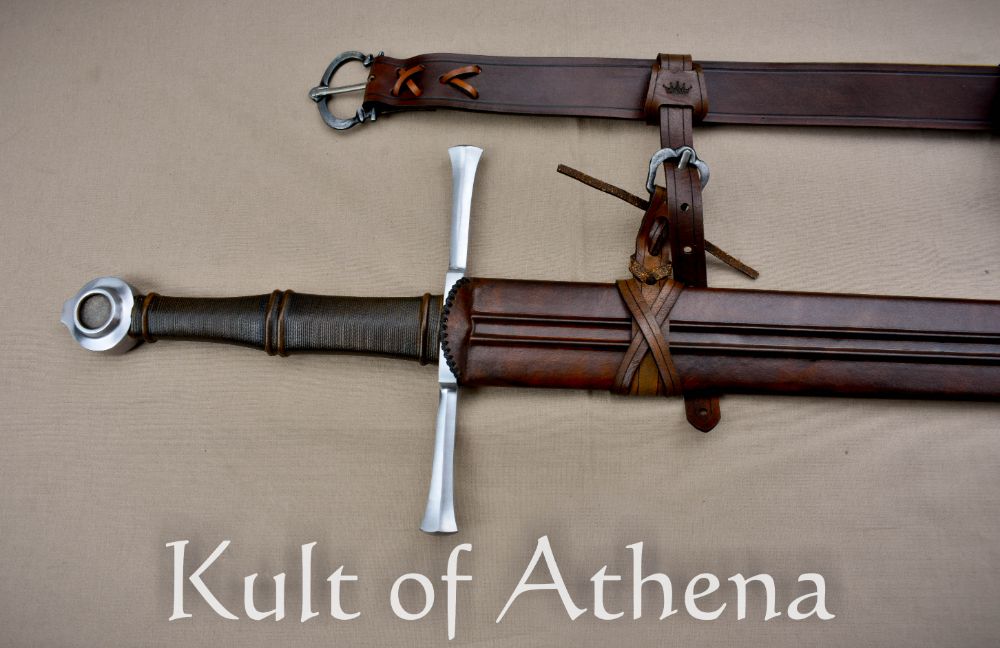 The sword is matched with a premium quality scabbard of wood which is overlaid with a tight binding of high quality leather. The sword hangers are both knotted and interwoven into the scabbard and these connect to a sword belt with sword hangers which can be used to adjust the height and angle by which the sword scabbard hangs from the included sword belt. The sword belt is made from durable and high quality vegetable tanned leather and it can be adjusted to fit around the waist with a metal buckle with a steel tongue.