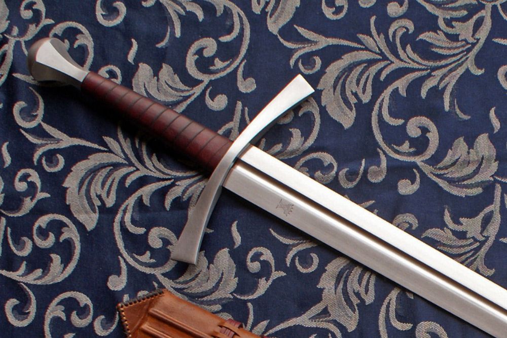 The blade is well-tempered 6150 high carbon steel which was finished with a 52 HRc hardness after tempering. Prior to tempering the steel was normalized twice over to better homogenize its carbon content to give it an optimized grain structure and equalized hardening. The crossguard and pommel are crafted from steel and the blade was anchored into the hilt with a solidly set hot-peen over the pommel. The hardwood grip is tightly bound in spiralled top-grain oxblood-hue leather to complete the sword.
