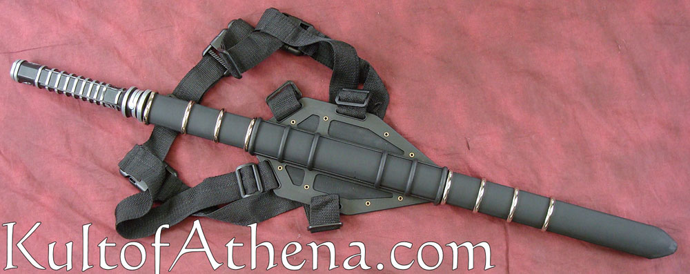 This unlicensed product is very similar to the Sword of the Daywalker from the Blade Trilogy. It has an unsharpened stainless steel blade. The guard and handle is metal, painted black with painted bare-metal color accents overlaid. It comes with a wood-core back scabbard with a hard plastic back plate and buckled woven straps. The scabbard is tightly covered with black leather vinyl and interspaced with integrated metal rings.
