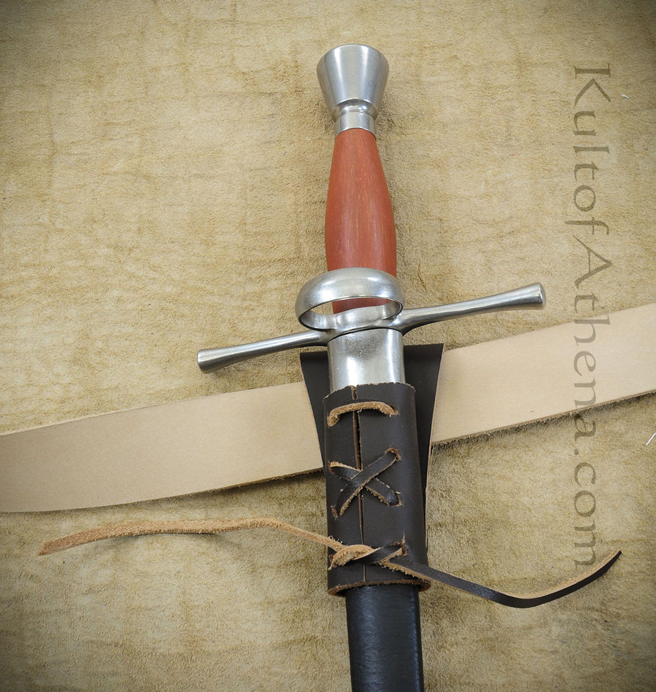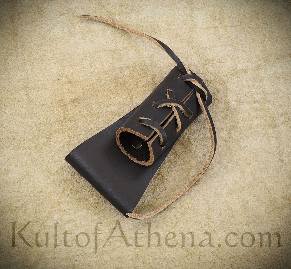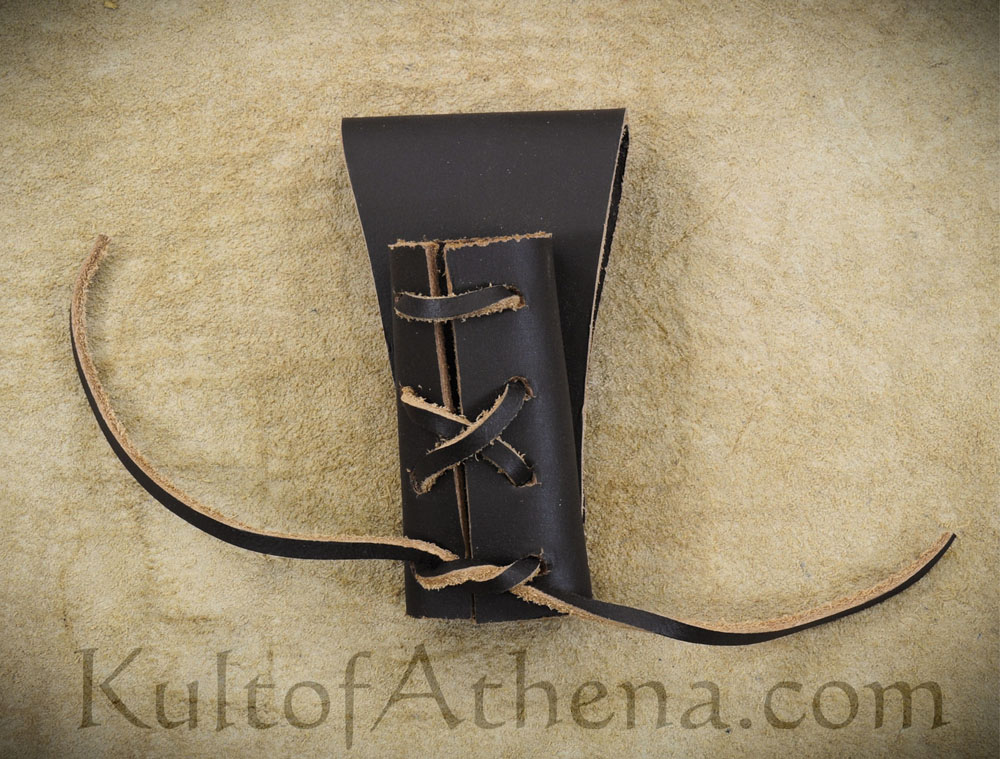 This dagger frog is of robust brown leather; its laced holder is best for a sheath of about 1 in width, though it can be adjusted to grip a slightly larger sheath.