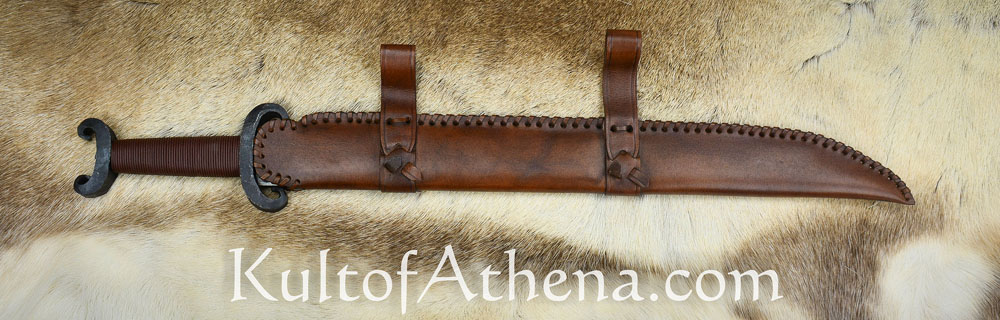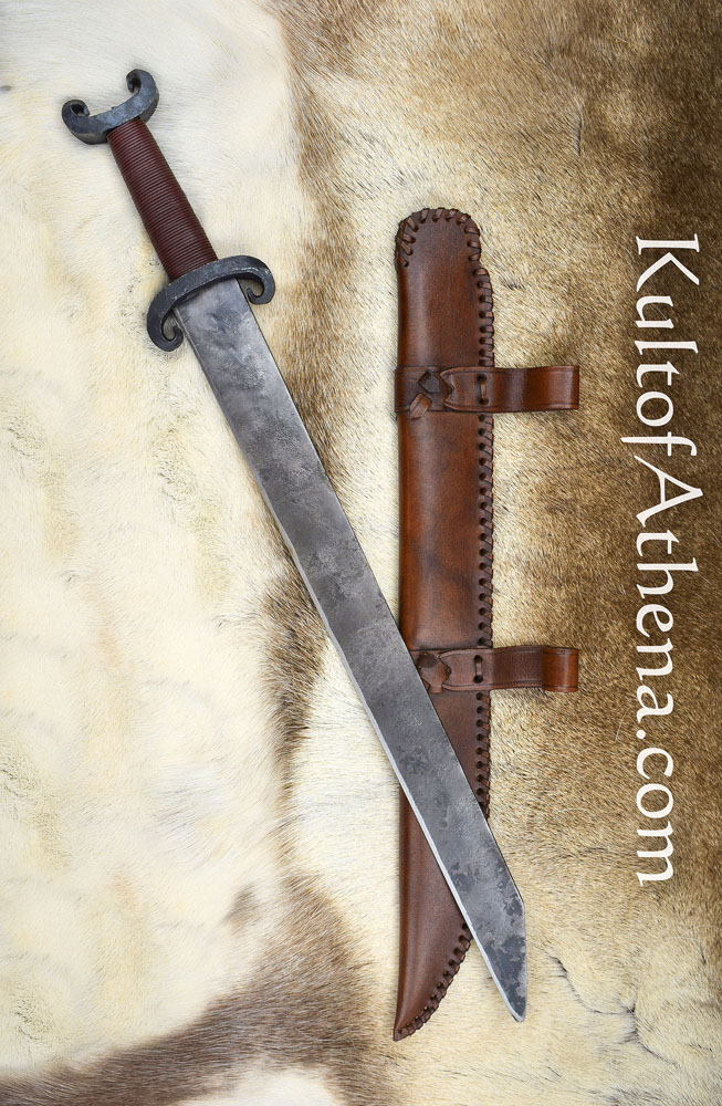 The hand-forged guard and pommel are crafted from steel and the hardwood grip is tightly bound in thick leather cord for a binding wrap. The blade is anchored into the hilt with a peen on the pommel for an overall solid build. The seax is matched with sheath of thick leather with thick leather cord construction complete with integrated belt loops for wear.