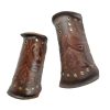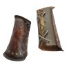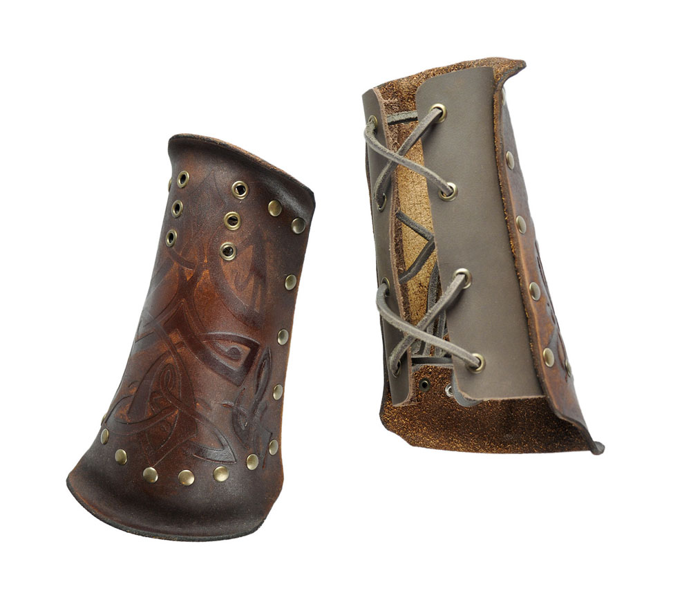 This set of Viking Leather Armor is crafted from high quality genuine leather with engraved Viking knotwork design. Skillfully crafted, they were made in Canada by Les Artisans d Azure. The robust and supple leather is 9-10 oz in thickness and constructed with durable antiqued brass rivets. They are widely adjustable to size with their leather cord lacing.