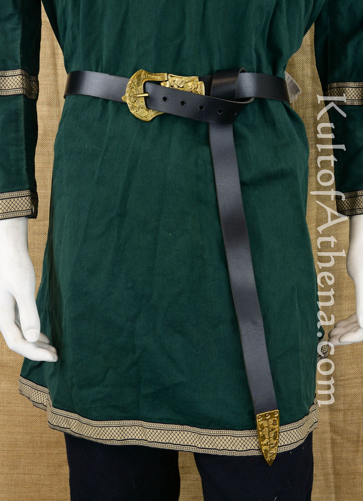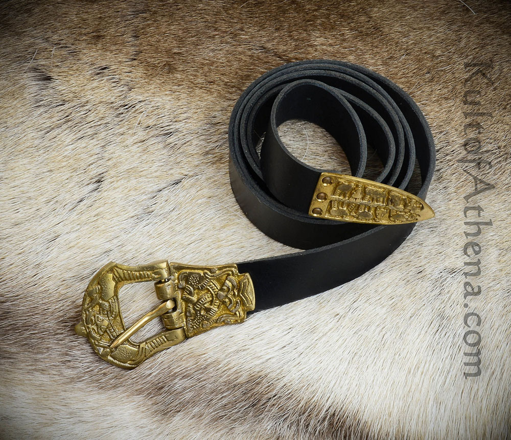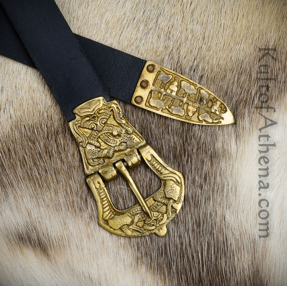 This Viking Belt has a large Viking style buckle and chape of detailed cast brass which are stoutly riveted to the thick belt strap of 7-8 oz leather. Available in three size lengths.