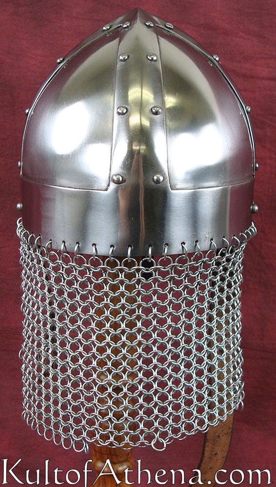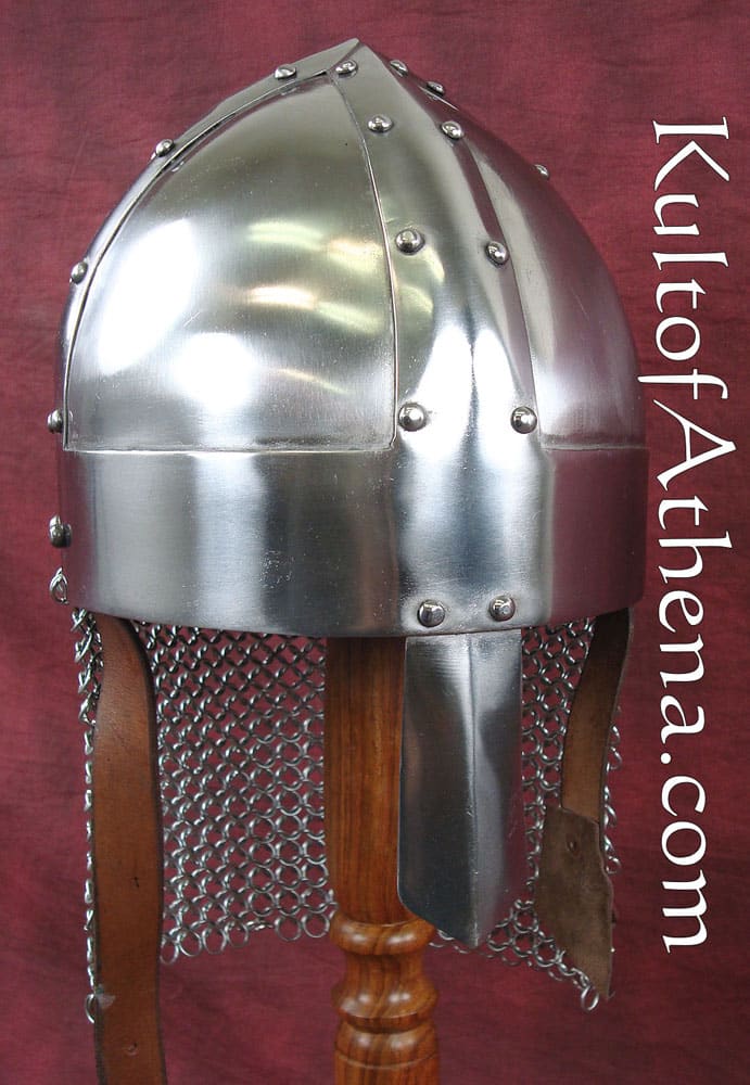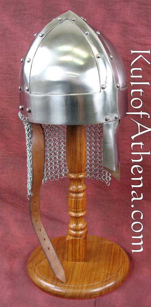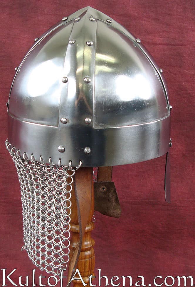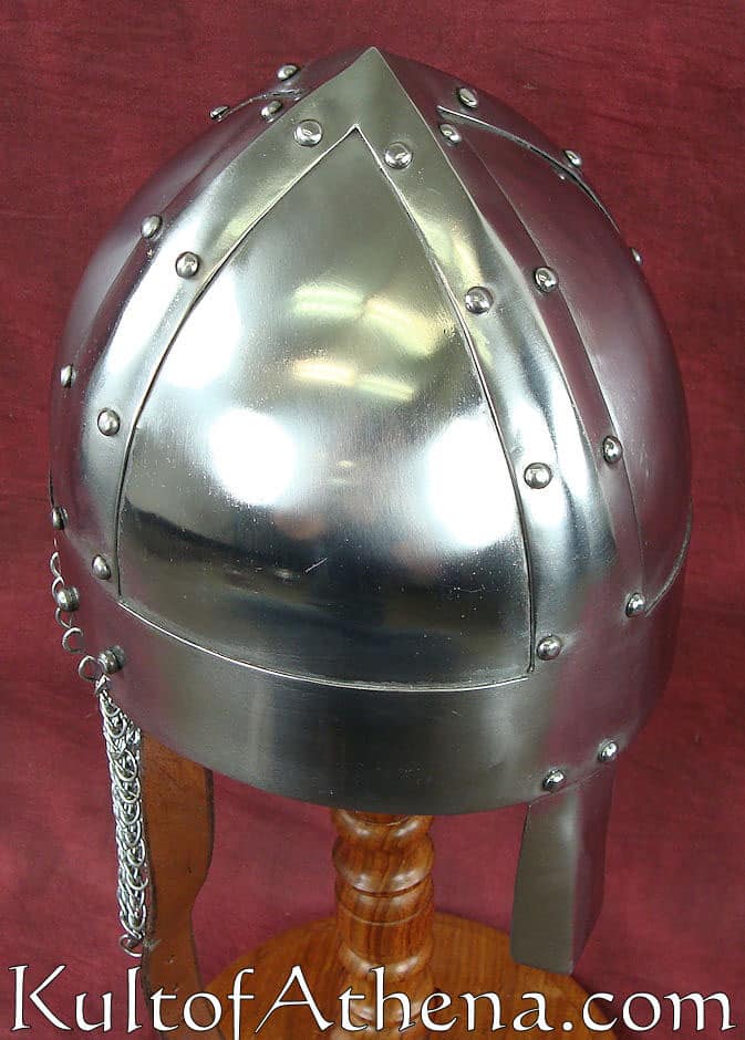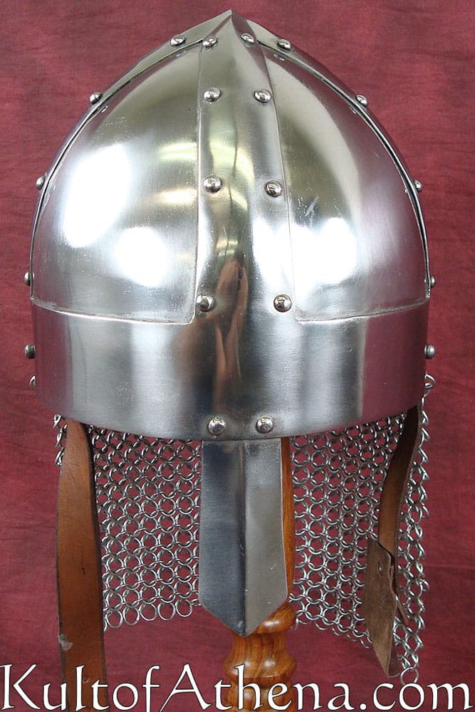 The Vikings weren’t always known for the flashiest or showiest of helmets, but they frequently wore some of the most effective for their period. This Viking Spangenhelm recreates one such helmet for the modern-day warrior to wear into battle. And warriors can not only wear this for great historical style, but they can also depend on it to keep them safe and secure from harm, too! This helmet echoes the look of a traditional spangenhelm, featuring a rounded, conical top shape that is reinforced by metal strips. The helm also features a nasal guard in the front, for added protection, as well as a short aventail attached to the back, to provide some mail protection to the neck. The helmet is crafted from 18 gauge steel and features a polished metal finish that gives it a handsome, newly minted gleam that looks great in the light.