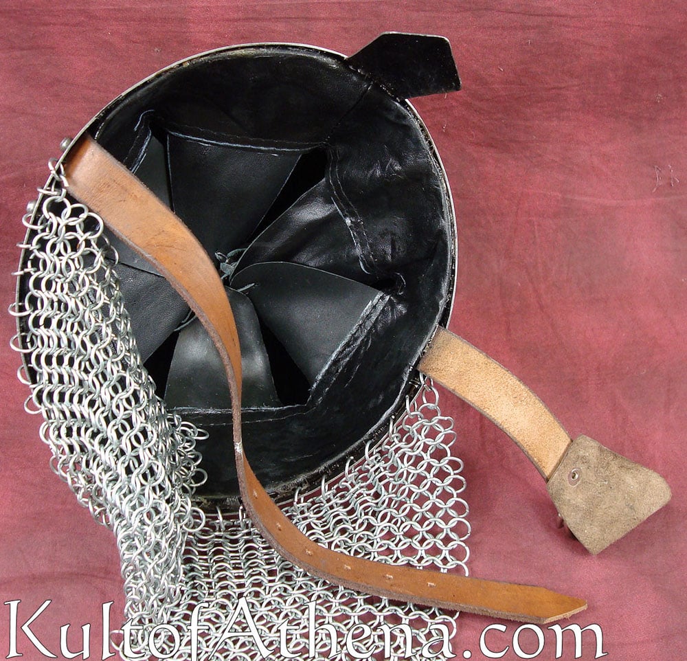 The interior of the helmet features a liner, both for comfort and for making small adjustments to size. It also has a leather chin strap with adjustable steel buckle to help keep it firmly affixed to the head. It is a full-sized replica helmet that is fully wearable, and when worn, it stands up rather well to the rigors and impacts experienced during the course of LARP combat and light reenactment. It is available in two sizes, either medium or large.