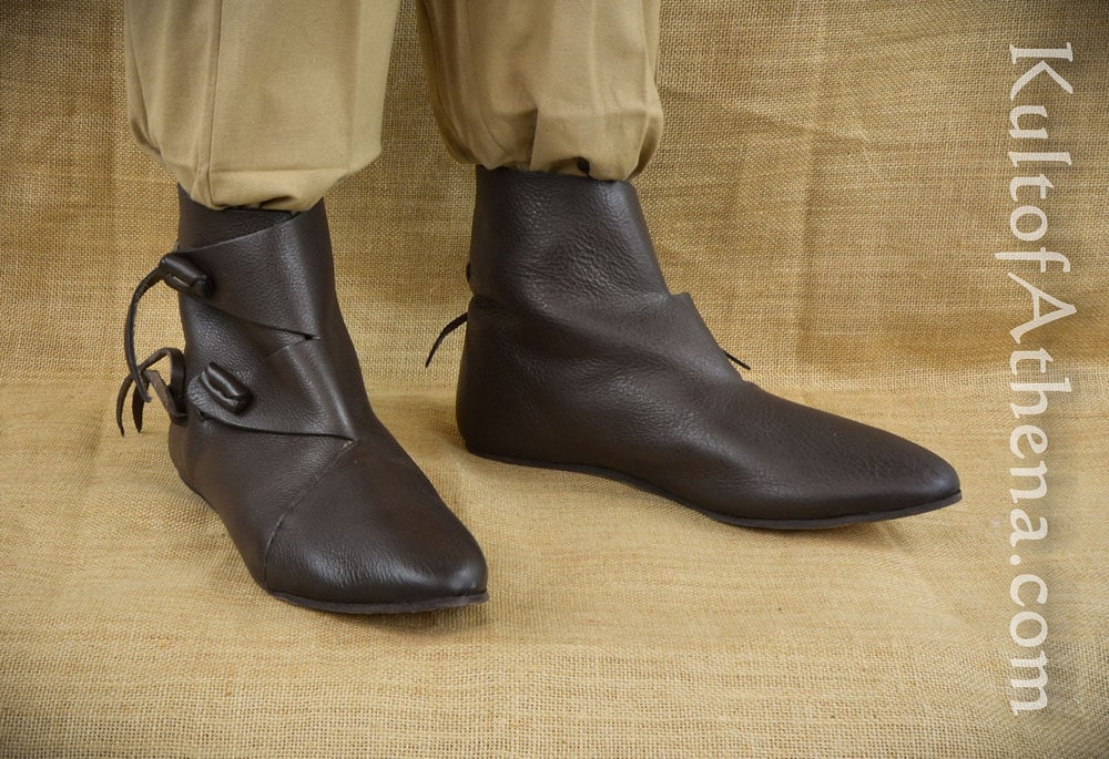 Not quite historic but sturdy shoes! They are not turn shoes but for wearing around with a thick wool sock they are very comfortable. I was able to tie mine off securely and wore them the day. I’m putting a padded insole in mine because I have bad feet. Normally wear a 10.5 glad I got 11.5 for options on socks, wrappings, modern insole, etc.