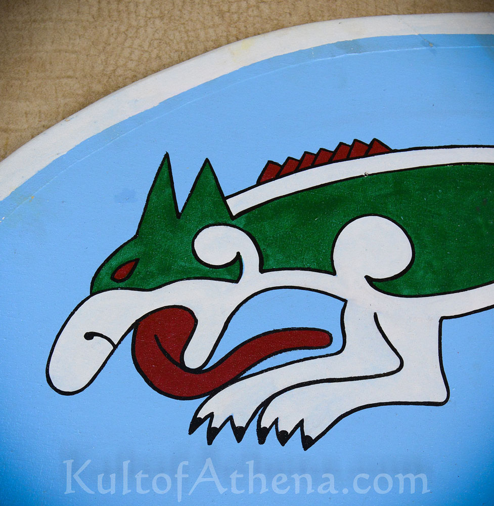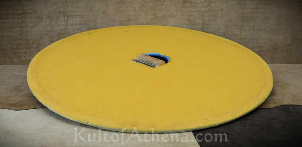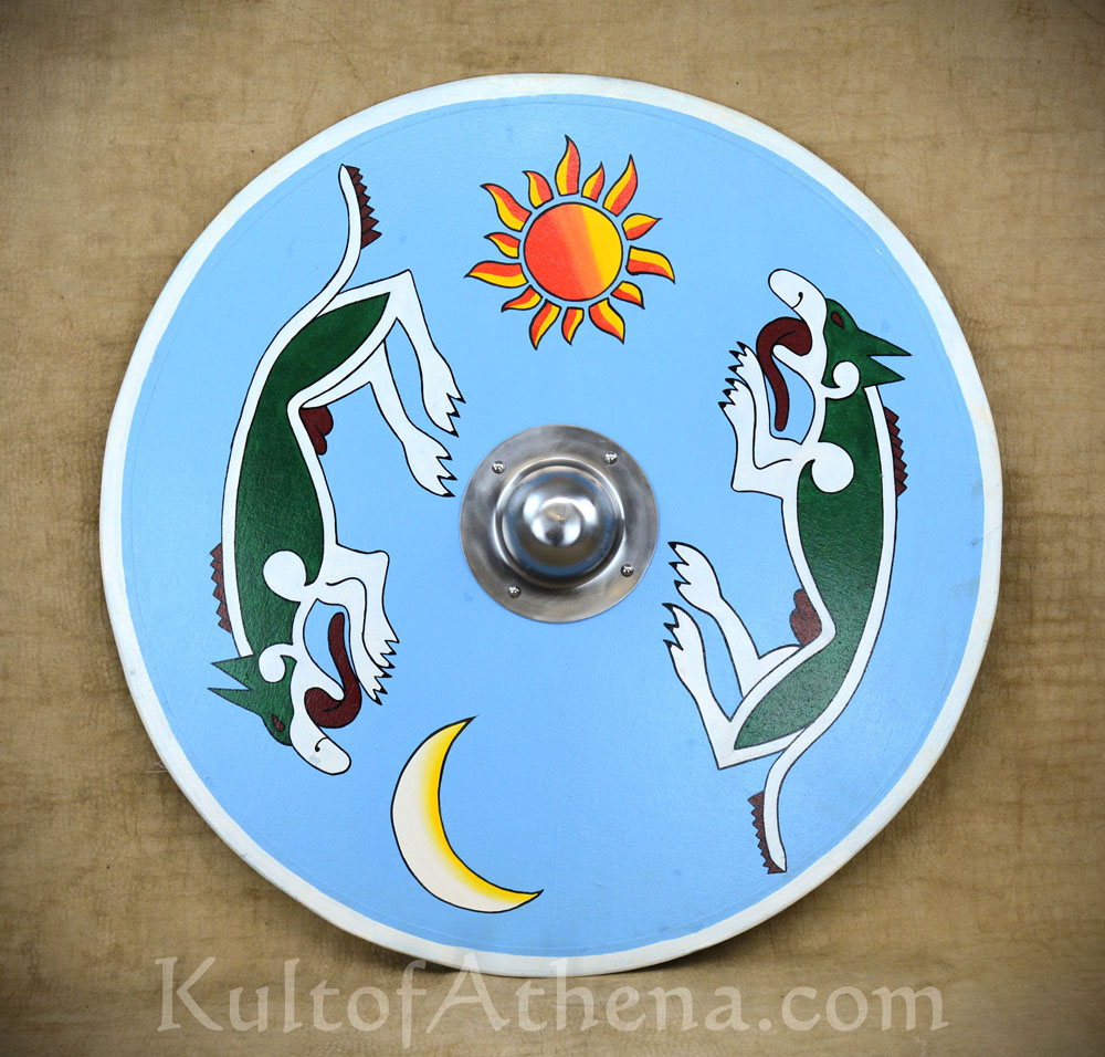 This Viking Shield is hand-painted with Norse Wolves; it is crafted with a core of Poplar wood which is tightly overlaid in a linen binding. The rounded horizontal grip is wood and the shield boss is steel.