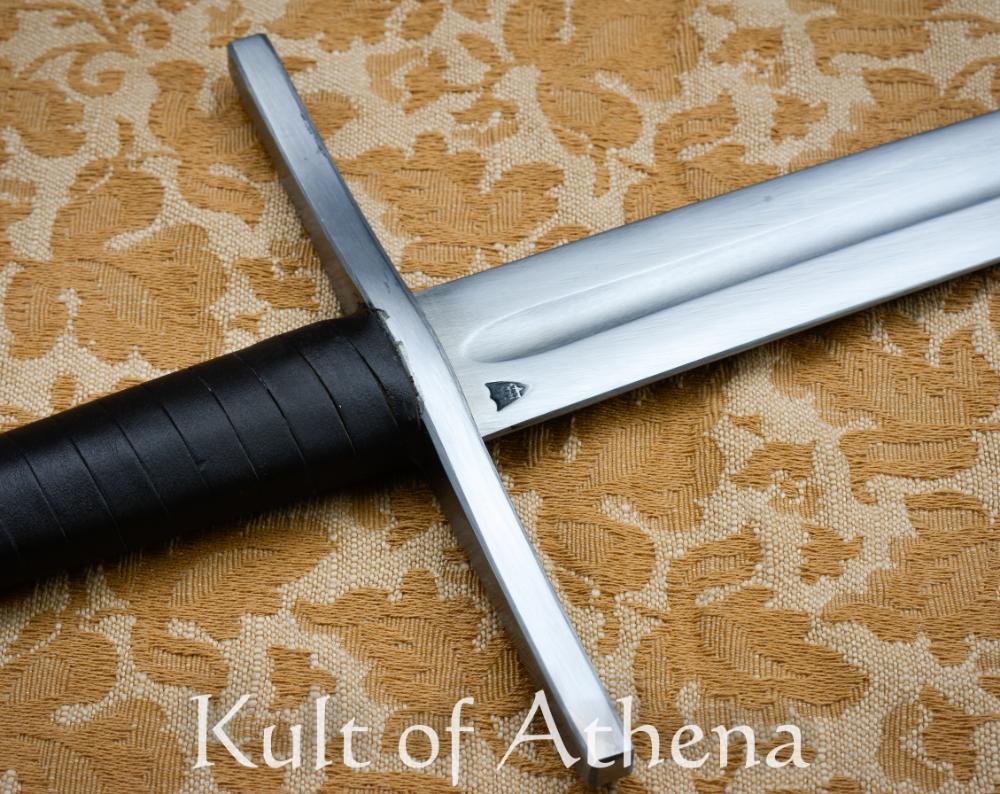 The hilt is built for strength and longevity. The steel crossguard and pommel anchor the blade securely, with the tang peened firmly over the pommel to create a durable mechanical construction. For additional reinforcement, the tang is welded to both the guard and pommel, ensuring the hilt remains rigid and dependable even during intensive use. The junction between blade and guard is also tightly fitted and reinforced to minimize movement at this critical stress point. The 8 5/8-inch grip, crafted from beechwood and wrapped in leather, provides ample room for a comfortable two-handed hold. This length allows practitioners to apply leverage for powerful strikes while maintaining precise control during binds and transitions. Despite its sturdy construction, the sword remains agile in motion. It weighs approx. 3 lbs 7 oz with a point of balance approximately 3 9/16 inches from the guard, giving it a responsive feel despite its tough construction.