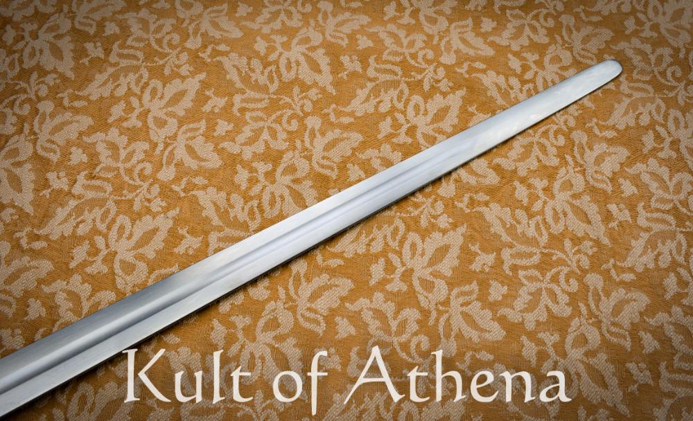 The blade measures 27 5/16 inches in length and is forged from CRV4 (51CrV4) high carbon spring steel, a material valued for its combination of resilience, flexibility, and durability. For safety in training and reenactment environments, the blade is intentionally blunted with edges approximately 2–3 mm thick and finished with a rounded spatulate tip. The blade is tempered to approximately 50–54 HRc, allowing it to absorb the stresses of repeated impacts while flexing and returning true.