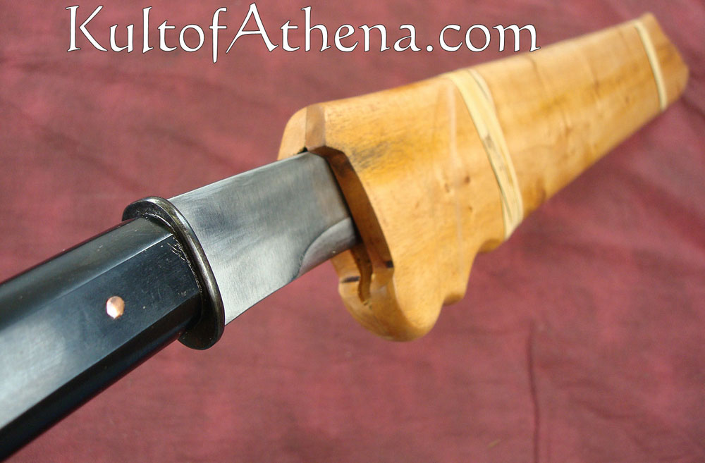 This Philippine-crafted Visayan Binagon has a sharp blade of 5160/D2 high carbon steel tempered to HRC 58-60. A simple guard and ferrule of darkened steel separate blade and grip. The grip is of carved wood with a brass nut on the pommel. A carved wooden scabbard with a blade-retaining clip is included. The metal clip locks the blade in place by going over the lip of the guard. It can be released by a good tug on the grip.