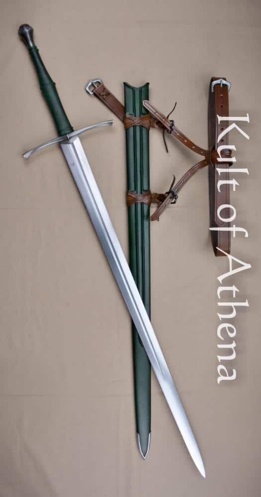 The blade of the Ranger sword painstakingly fine-tuned for performance cutting and exquisite balance and handling by Angus Trim and though it is a fantasy sword it will cut, slash and thrust with all the efficiency and quality of a premium-tier longsword. The blade is crafted from 5160 high carbon steel with a spring-tempered hardness of 51-53 HRc. A hot-peen construction that melds the blade and hilt together at the pommel gives it a very strong and lasting hilt construction. The crossguard and pommel are crafted from steel with an antiqued finish and the grip is carved from Poplar and tightly bound in deep green leather to complete the sword.
