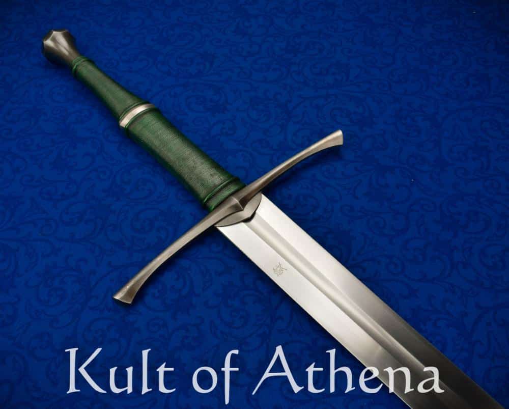 The blade of the Ranger sword painstakingly fine-tuned for performance cutting and exquisite balance and handling by Angus Trim and though it is a fantasy sword it will cut, slash and thrust with all the efficiency and quality of a premium-tier longsword. The blade is crafted from 5160 high carbon steel with a spring-tempered hardness of 51-53 HRc. A hot-peen construction that melds the blade and hilt together at the pommel gives it a very strong and lasting hilt construction. The crossguard and pommel are crafted from steel with an antiqued finish and the grip is carved from Poplar and tightly bound in deep green leather to complete the sword. It also has a metal grip collar in the midsection of the grip for some unique character,