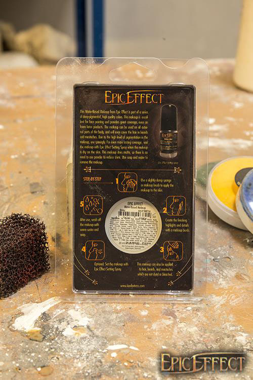 Apply makeup using a moist brush or sponge. Great for use on the face, but can also be used all over the body–including delicate skin around the eyes. Can also be used to colour beards, hair, or moustaches. Seal the finished makeup with Epic Effects Setting Spray. Remove with mild soap and warm water.