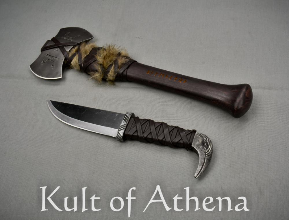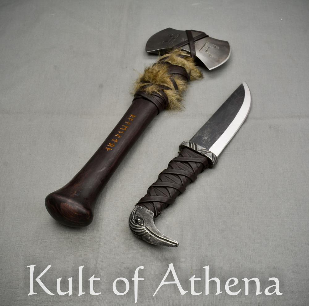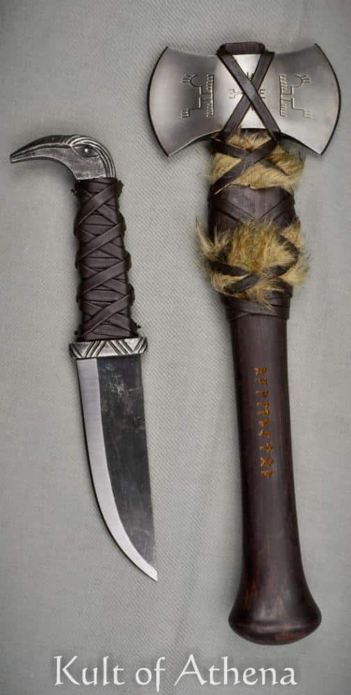 Inspired by the sweeping epics of Norse mythology comes this wood boxed gift set of Viking belt tools; a hatchet and dagger and each are deeply infused with Viking legendary character. The double-headed hatchet axe is built solidly for light camp duties or self defense in a pinch and has an antique-finished axe head of tempered 1055 high carbon steel. It is embellished with ancient Nordic runes: Raido (journey), Fehu (wealth), Wunjo (joy), Ehwaz (movement), Naudiz (need), Eihwaz (defense), Teiwaz (warrior), Othila (separate), and Thuisaz (giant). The handle is dark stained hardwood which is finished with etched Norse runes. Faux fur gives it a finishing touch of northlands flair.