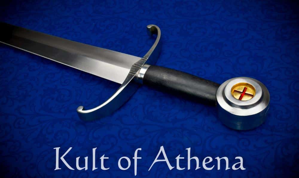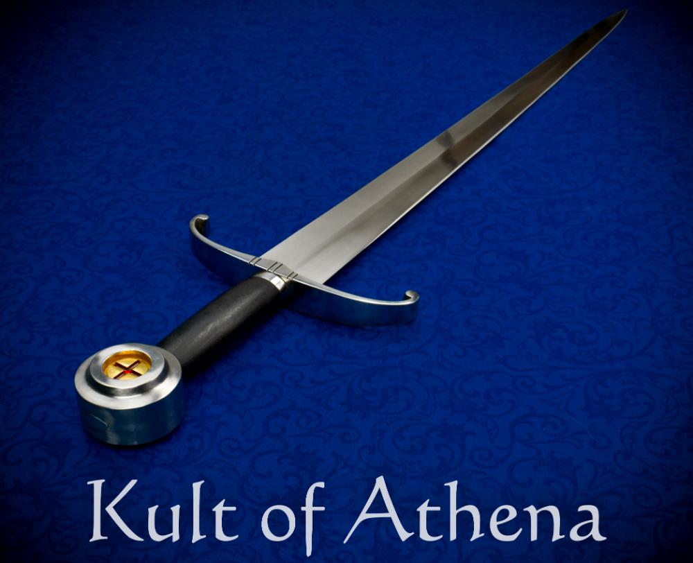 This recreation, like the original, is nimble in the hand and a able 15th century cut and thrust sword. The blade is tempered and sharpened 1065 high carbon steel. The guard and pommel are crafted from steel and the pommel may look overly large, but like the original the pommel is actually hollow so that the weight / balance of the sword can be more precisely controlled. The interior of the pommel recess is gold plated with the cross picked out in contrasting red enamel. The hardwood grip is bound in leather and the hilt is sturdily constructed with the tang of the blade peened over the pommel for a robust construction. Included with the sword is a stitched scabbard of thick and tough leather which is reinforced with a stiff leather core to give it a dual layer construction that makes it substantially more firm and rigid than a simple, standard one layer leather construction. It is fitted with an integrated sword belt of thick leather and a steel chape. The belt can be adjusted to size with ample room to add your own holes if necessary to make it larger or smaller.