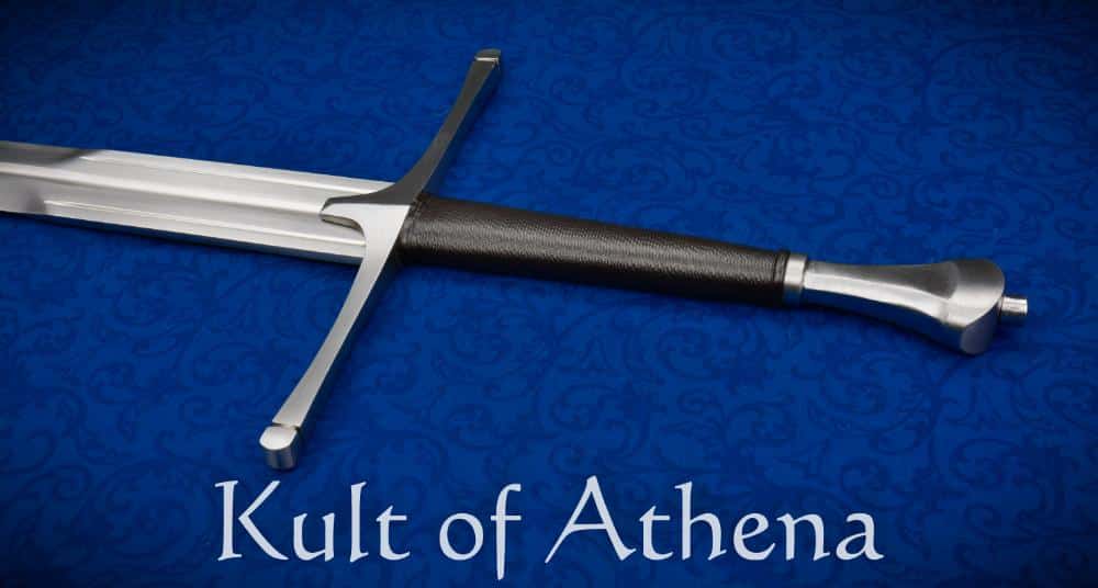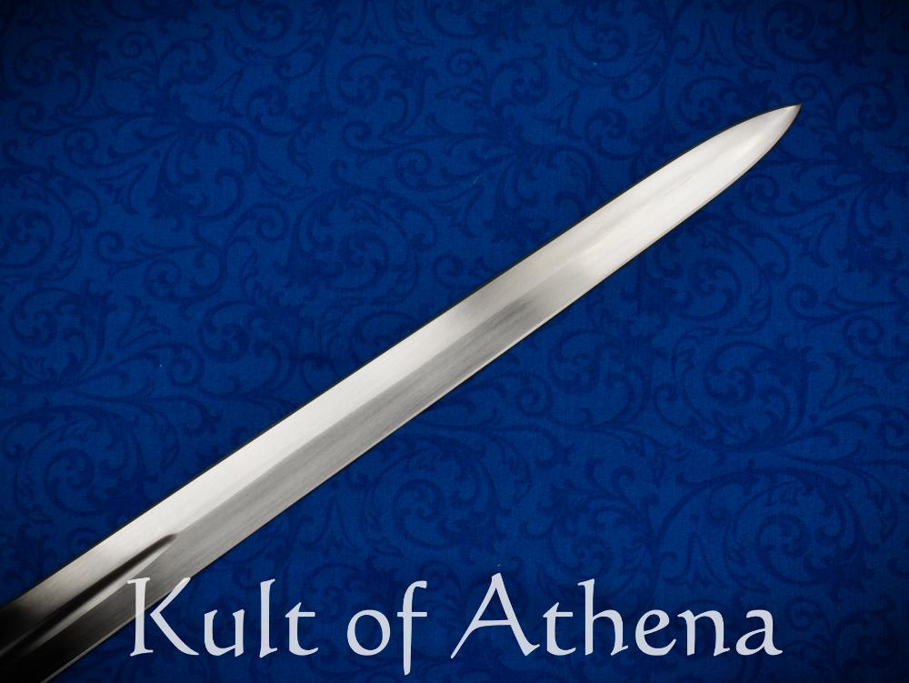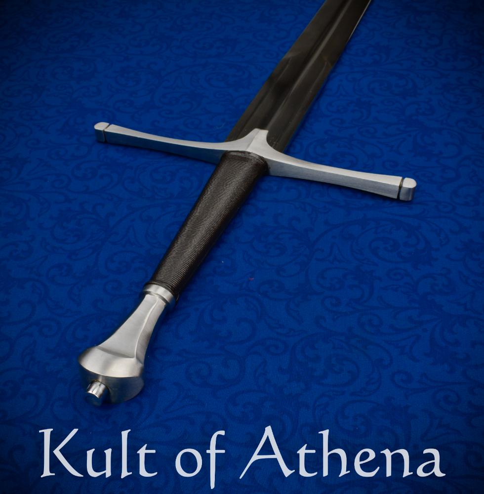 This early 15th century longsword is of a practical, yet elegant design built for rigors of war and campaign for a professional warrior. The blade is forged from high carbon steel and has a complex, multi-fullered design combined with a thick ricasso at the base of the blade. The grooves reduce unneeded weight and the thickened ricasso greatly aids in stiffening the blade and imparting additional durability. This ricasso serves as a great hand-hold from which to grip the blade for half-swording techniques and when used in this manner the flared pommel acts as a superb anchor for the other hand for a widened and stabilized grip – ideal for combat in closer quarters or to deliver a powerful and controlled thrust to a target. Altogether these blade design elements create a versatile longsword which lends itself well to the cut and thrust alike.