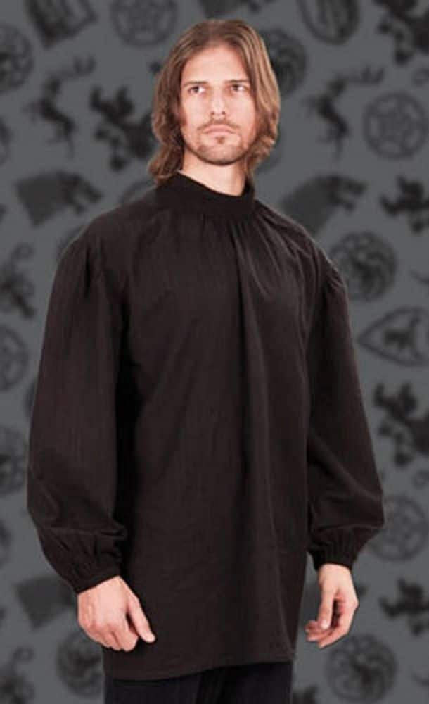 Jon Snows Nights Watch Shirt is a simple black shirt that reflects the austere conditions lived by the men of the Nights Watch. Fashionable in a simple sense, it is loose enough not to be a hindrance in a swordfight. Crafted from black cotton, the shirt has a wrap-around collar that is connected with two rear neck buttons.