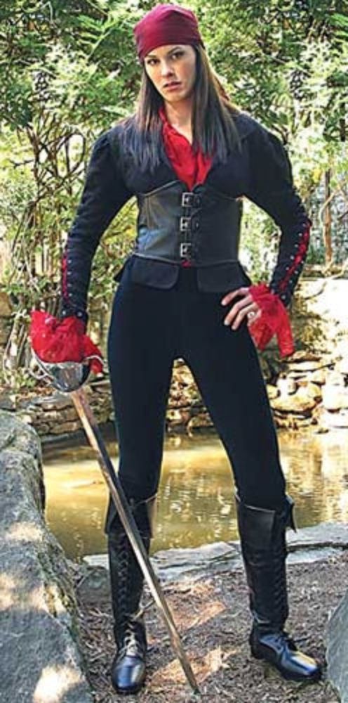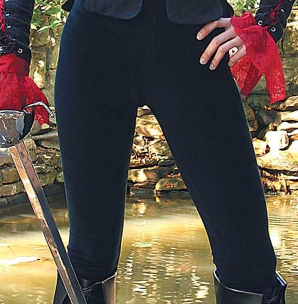 These 100% cotton black stretch velour pants have leather straps which buckle around your calves.  Looks great alone or with our Pirate ensemble. Dry Clean Only. Choose from S(8-10), M(12-14), L(16-18) and XL(20).