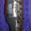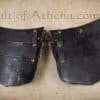 This Womans lower torso armor is a segmented armor piece – it is pieced together from two halves of riveted and articulated 20 gauge steel and fitted and adjusted to size with a series of leather straps and antiqued steel buckles on its two sides. It comes with a pair of tasset plates that can be buckled onto to the lower front of the armor. The interior of the armor is blackened.