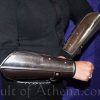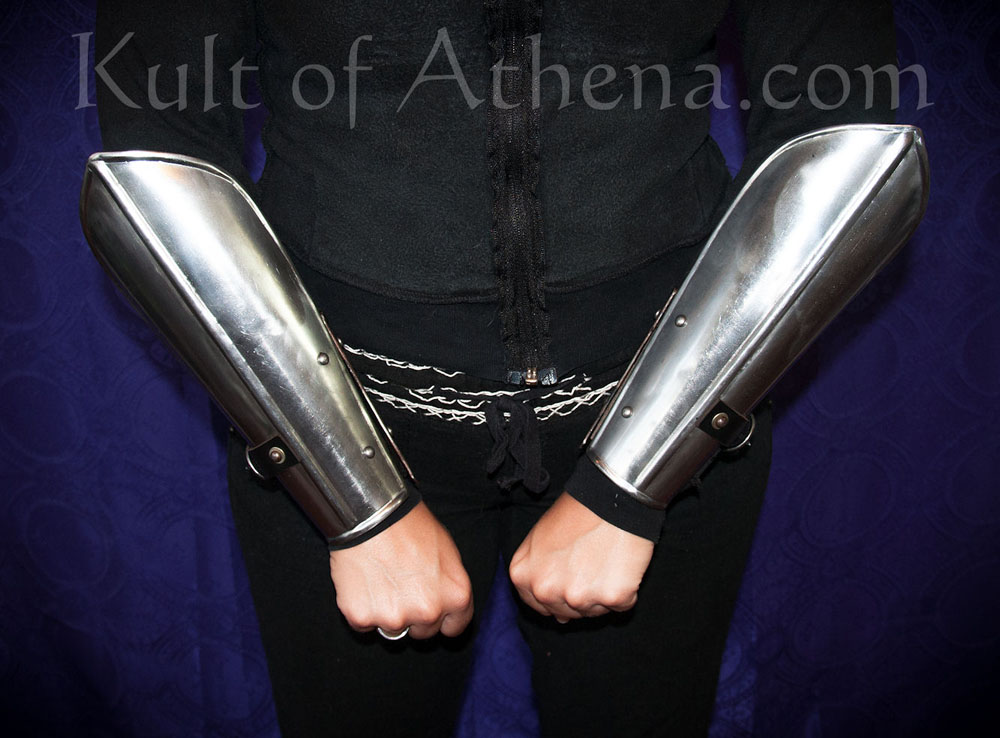 These Womens Bracers are crafted from 20 gauge steel. They are comprised of two pieces – a forearm plate and a lower wrist plate linked with a steel buckle and leather strap. This construction allows this armor piece to be sized and fitted to the lower arm. The interior of the armor is blackened.