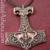 This bronze Thor’s hammer, designed by Czech artist Kati, depicts human body parts mixed with others inspired by arthopods for a uniquely alien, futuristic Thors Hammer. Comes with a leather neck thong.