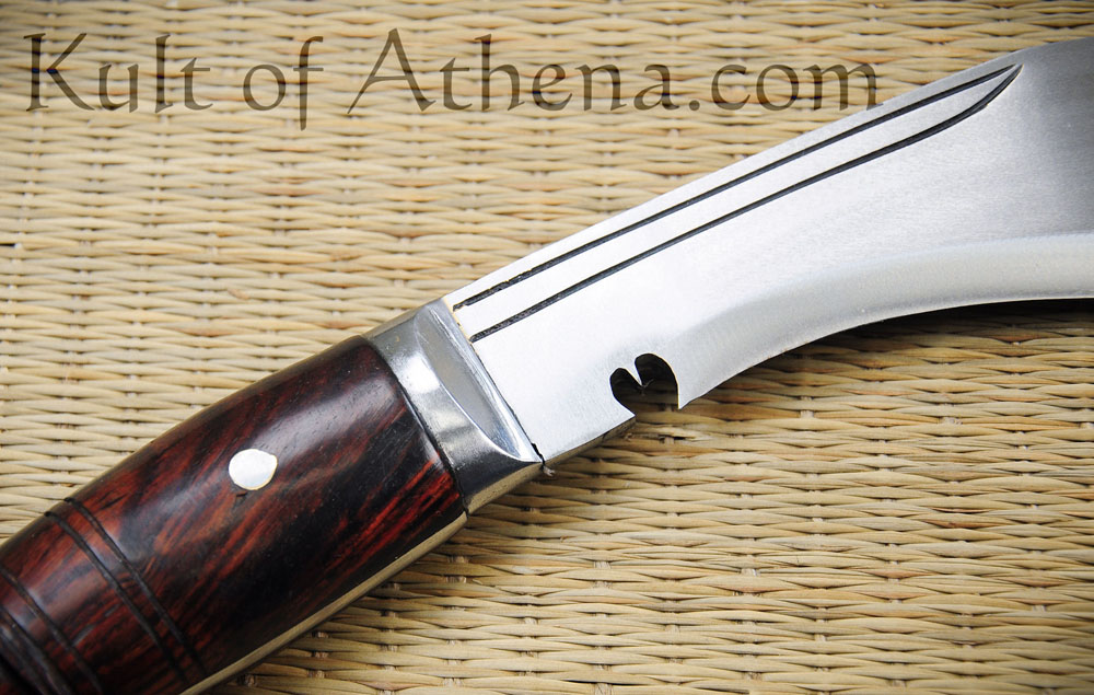 The large grip is of carved rosewood and has been riveted into the thick blade tang. It is surmounted by a bolster of steel. It has a pre-drilled hole for a lanyard.