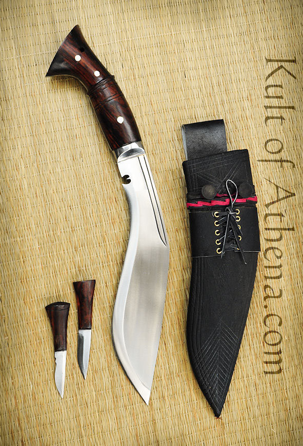 The scabbard is of carved pinewood and crafted with the traditional Nepalese ”Laha” tree gum glue. It is fitted with a layer of tight black leather. It has an integrated belt loop and decorative, colored leather stitching on its front. It has two internal retainers for the ”karda” utility knife and the ”chakmak” sharpening tool – the traditional companion survival tools of the Khukuri knife. These are likewise crafted from high carbon steel and are fitted to handles of rosewood.