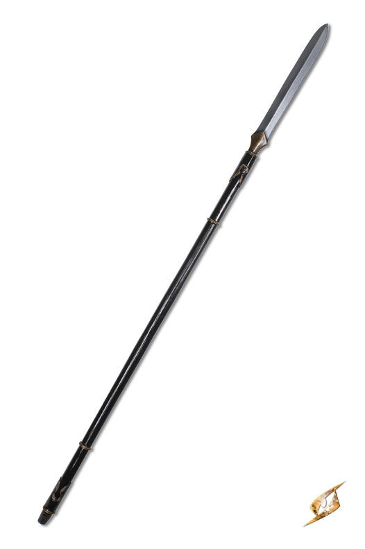 Epic Armoury’s Yari is an impressive 200 cm latex polearm inspired by the weapon that served as the backbone of feudal Japan’s infantry. This Yari is handpainted and sculpted, and the finished result is a beautiful weapon with a long double-edged 55 cm spearhead. A short golden ricasso attaches the spearhead to a black-lacquered and gold trimmed pole inspired by Asian design.