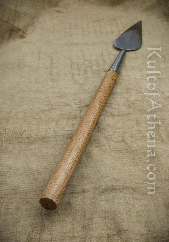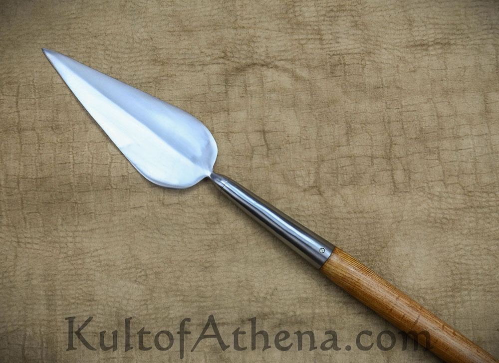 This Zulu Iklwa Spear has an unsharpened steel spearhead mounted and pinned onto a thick and sturdy hardwood haft. The spearhead is threaded onto the haft.